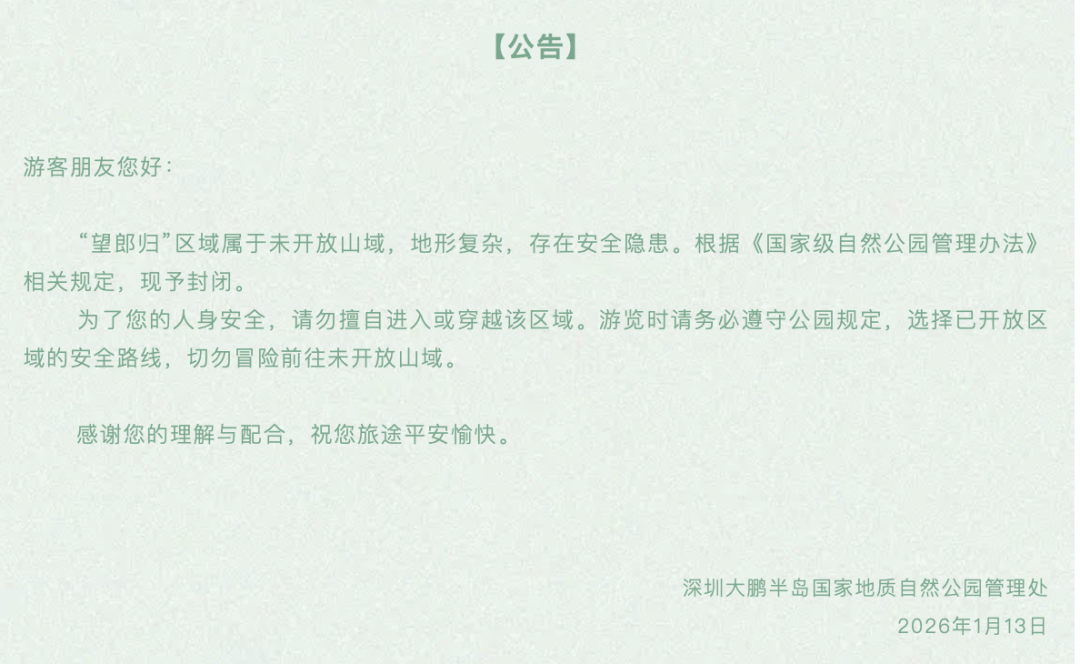 该公告提醒,“为了您的人身安全,请勿擅自进入或穿越该区域。游览时请务必遵守公园规定,选择已开放区域的安全路线,切勿冒险前往未开放山域”。