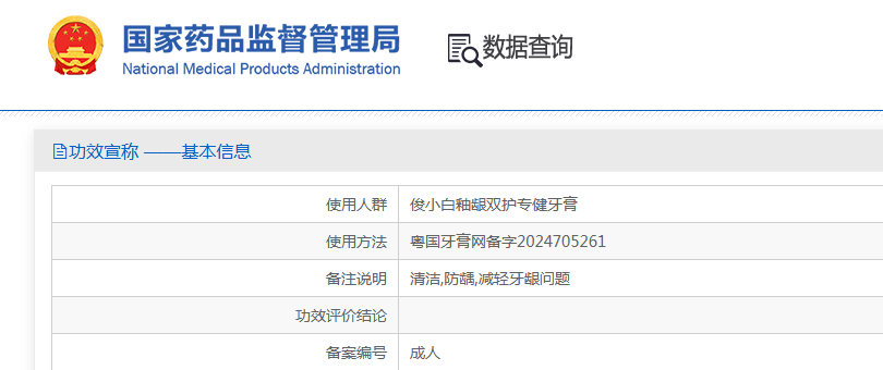 俊小白在网络上以“修护牙釉质再矿化”为卖点,据国家药监局备案显示,该款牙膏的功效宣称仅为“清洁”“防龋”等。除产品名称外,无任何“修护”“护釉”类描述。