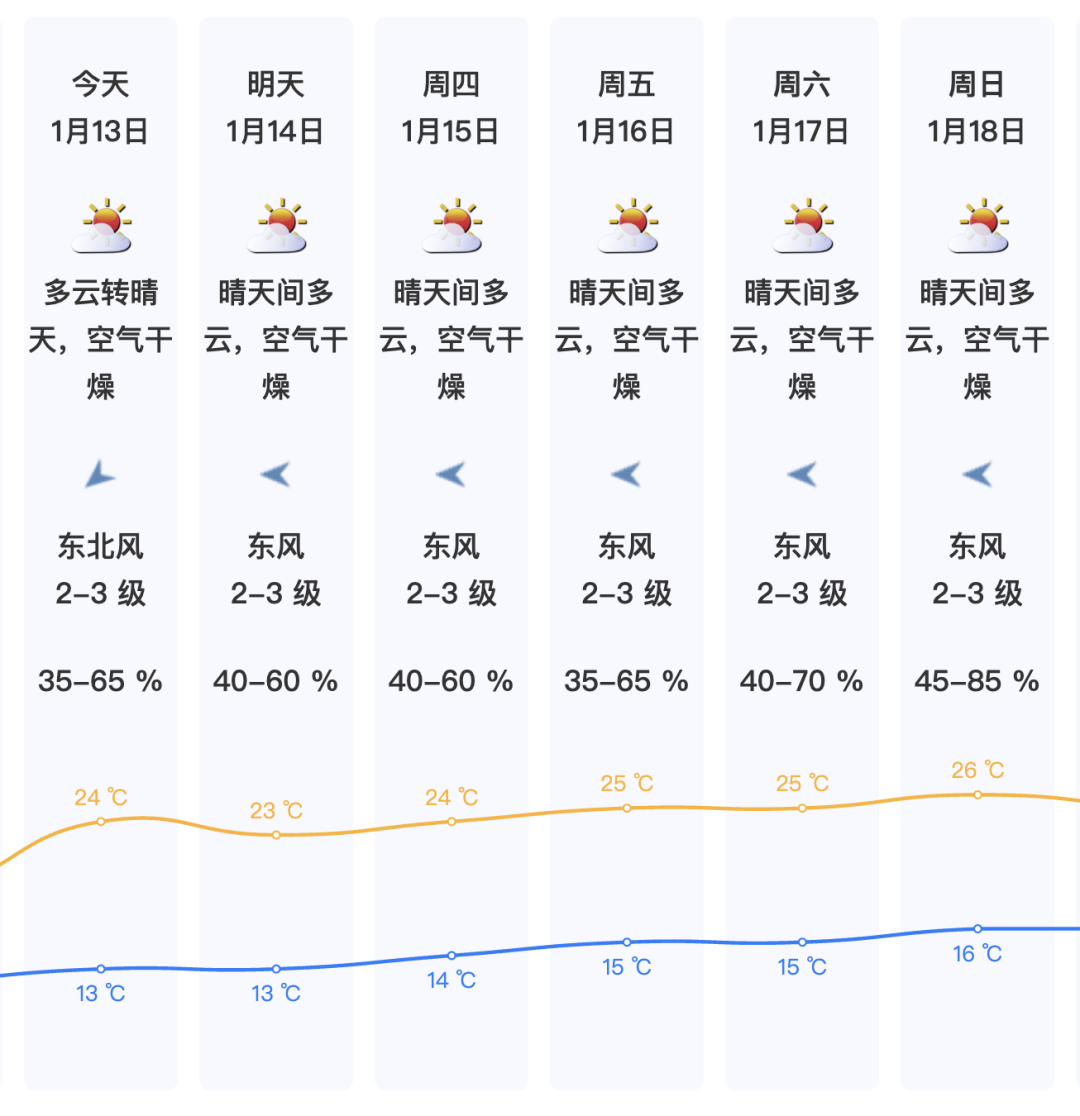 13日晴天间多云,空气干燥,气温14-25℃;