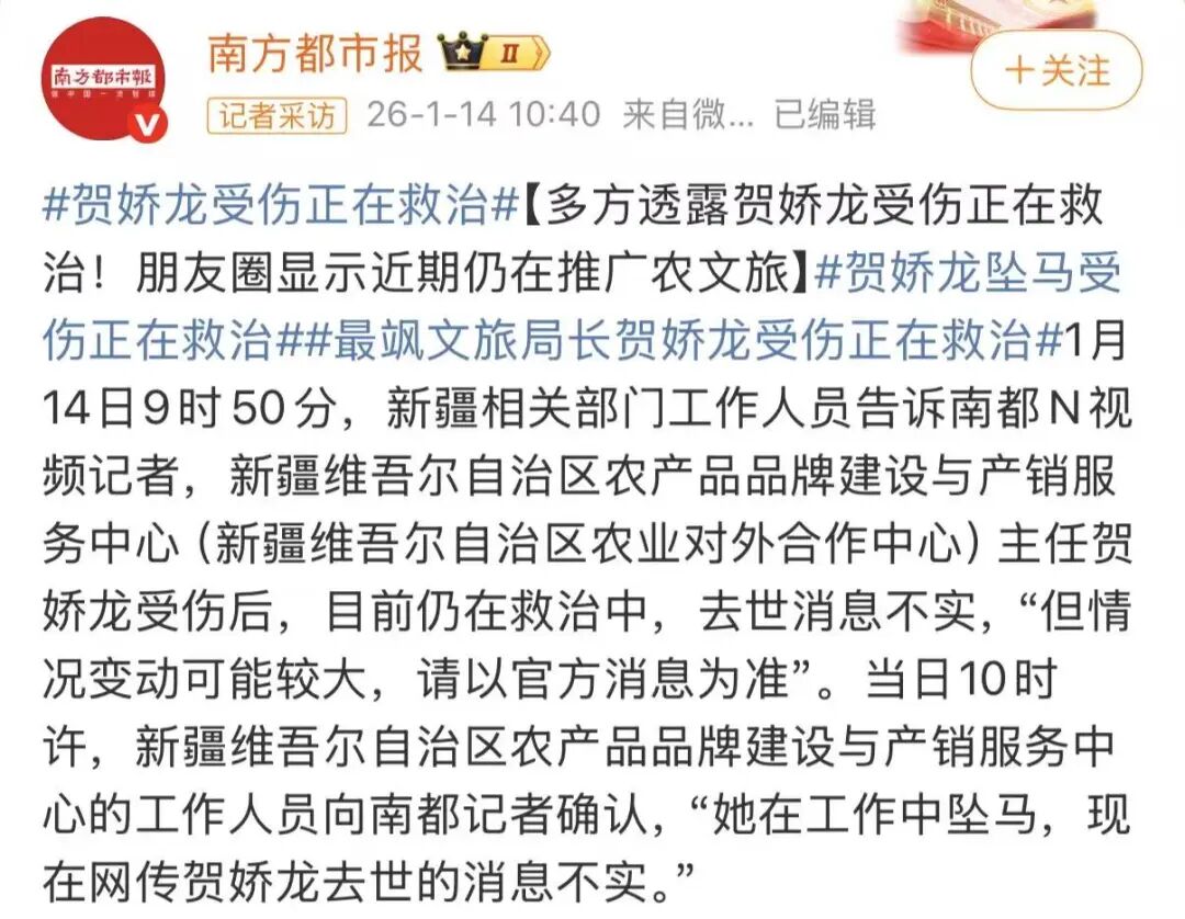 南方都市报报道,9时50分,新疆相关部门工作人员告诉记者,贺娇龙受伤后,目前仍在救治中,去世消息不实,“但情况变动可能较大,请以官方消息为准”。