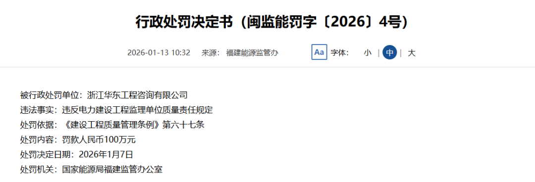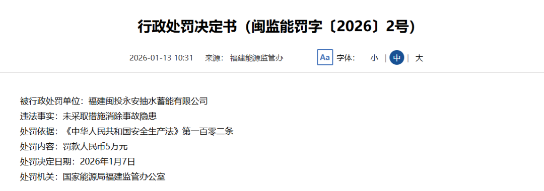 1月13日,国家能源局福建监管办公室对中国水利水电第三工程局有限公司、福建闽投永安抽水蓄能有限公司、浙江华东工程咨询有限公司(监理单位)分别发出《行政处罚决定书》,罚款金额分别为18731734.66元、5万元、100万元。