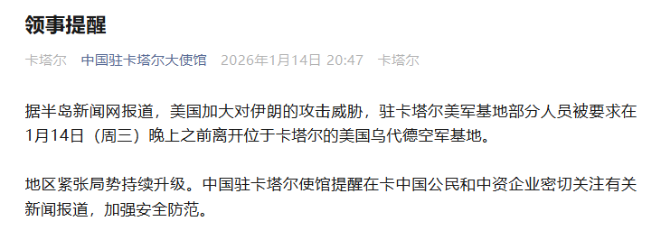 1月14日,中国驻卡塔尔大使馆发布领事提醒: