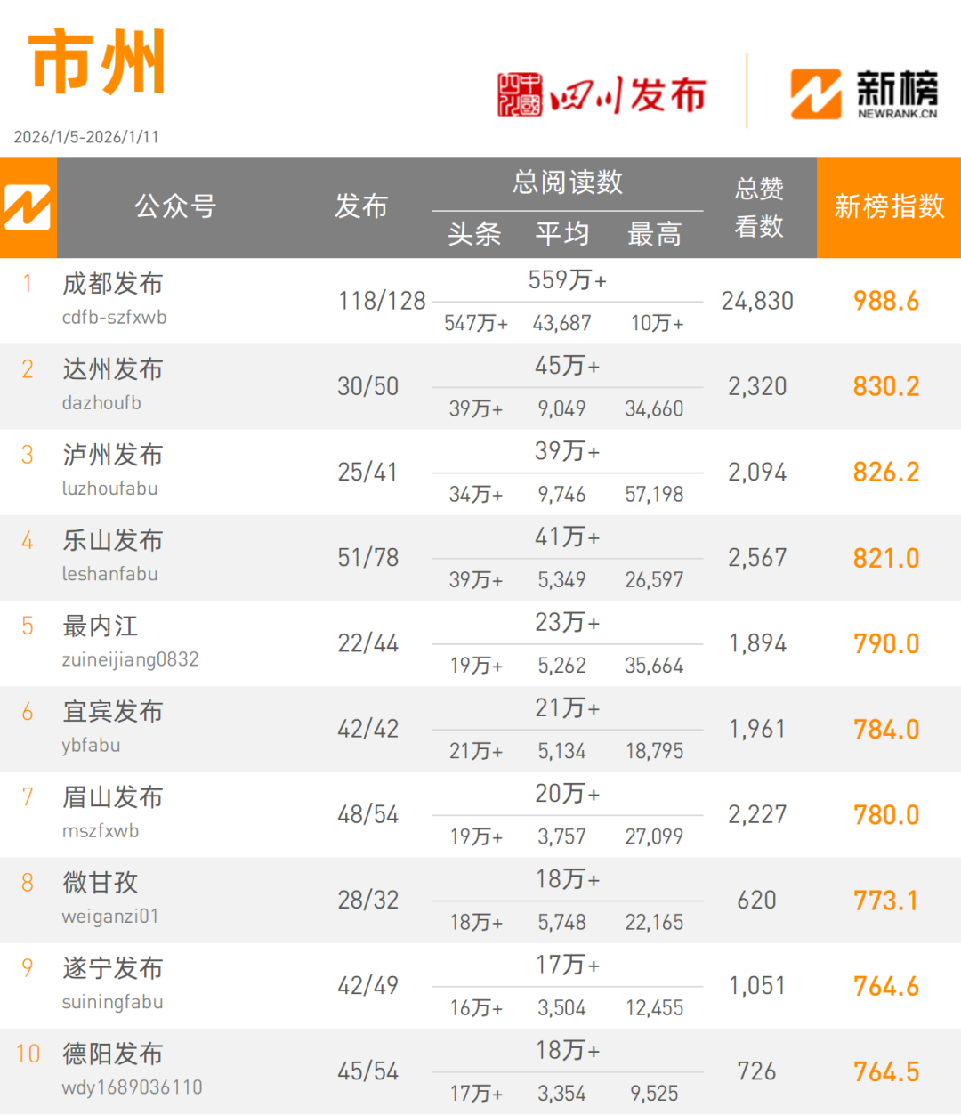 在本周市(州)榜单中,“成都发布”发文128篇,以5590000+次阅读量总数988.6的新榜指数摘得市州类榜单桂冠;“达州发布”发文50篇,以450000+次阅读量总数,830.2的新榜指数获得市(州)类榜单亚军。