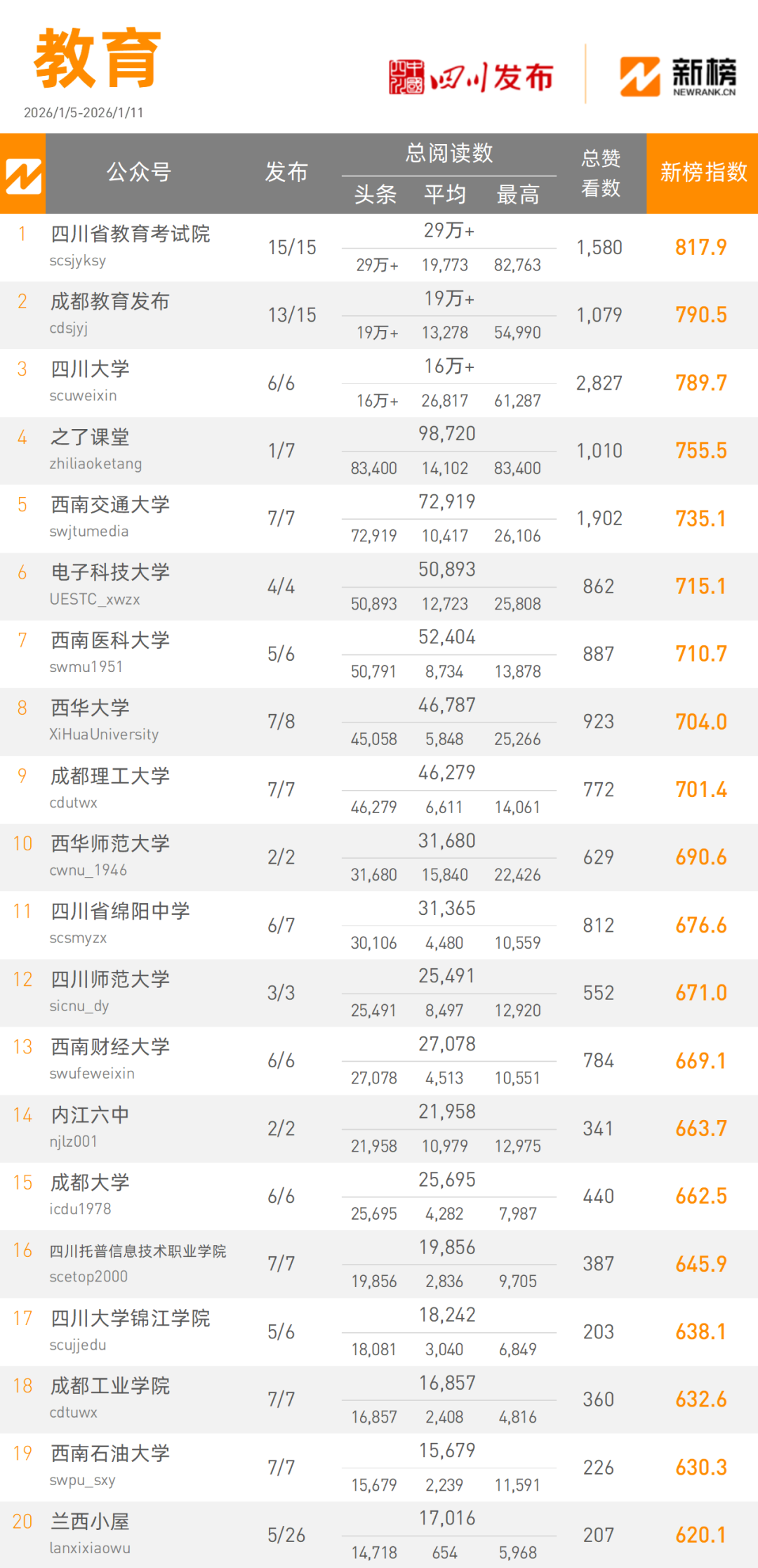 “四川教育考试院”本周以290000+次阅读量总数,817.9新榜指数领跑教育类榜单,“成都教育发布”本周以190000+次阅读量总数,790.5新榜指数获得教育类榜单第二名。
