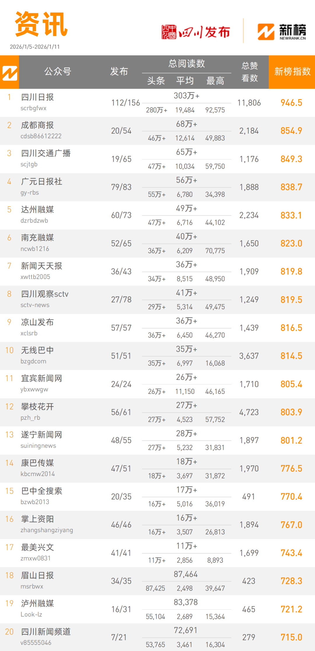 “四川日报”以3030000+次阅读量总数,946.5的新榜指数获得资讯类榜单第一名,“成都商报”本周以680000+次阅读量总数,854.9的新榜指数占据资讯类榜单第二名。