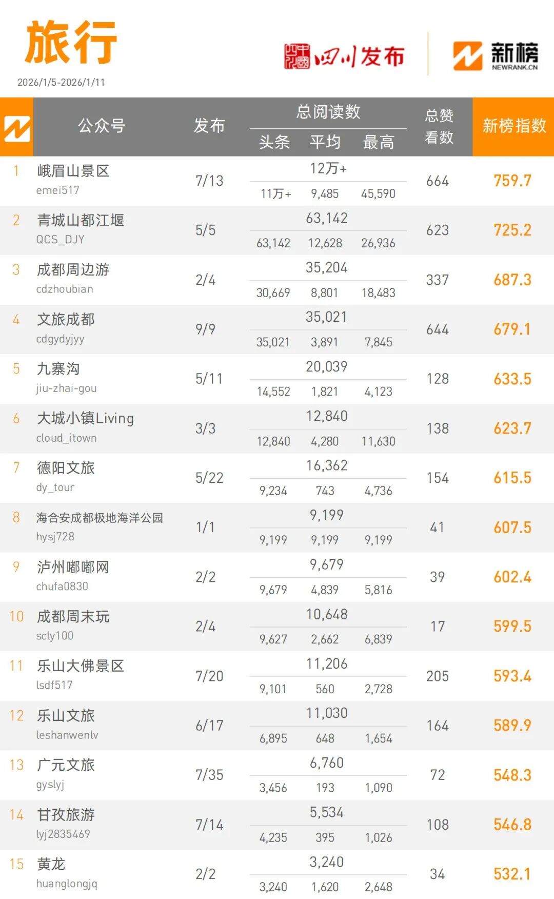 “峨眉山景区”本周以120000+阅读量总数,759.7的新榜指数摘得旅行类榜单桂冠,“青城山都江堰”本周以63142阅读量总数,725.2的新榜指数将旅行类榜单榜眼收入囊中。