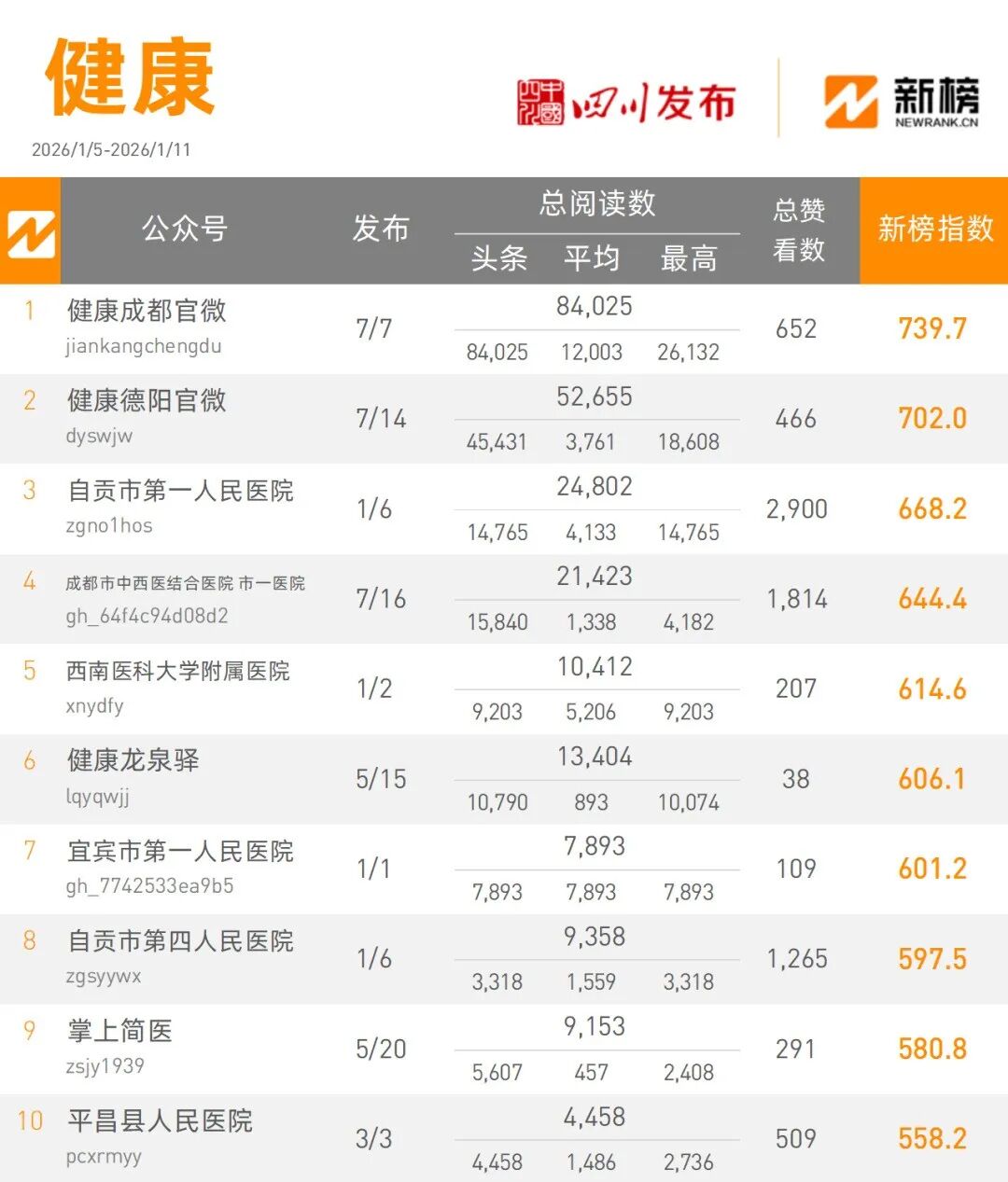 “健康成都官微”本周以84025次阅读量总数,739.7的新榜指数占据健康类榜单冠军宝座,“健康德阳官微”凭借52655阅读量总数,以702.0的新榜指数获得健康类榜单亚军。