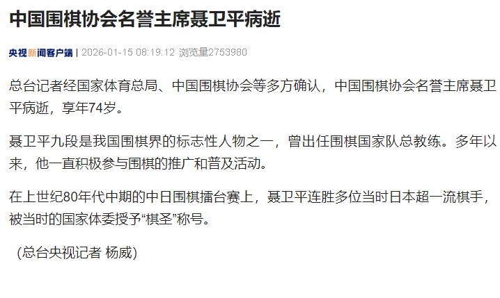 总台记者经国家体育总局、中国围棋协会等多方确认,中国围棋协会名誉主席聂卫平病逝,享年74岁。