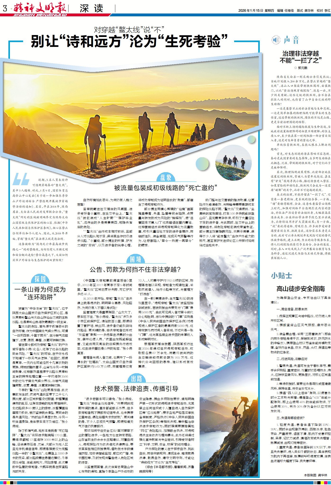 户外探险的意义在于探索自然、挑战自我,而非突破规则、漠视生命。唯有敬畏法律、敬畏自然、遵守文明守则,才能让“诗和远方”不沦为“生死考验”。