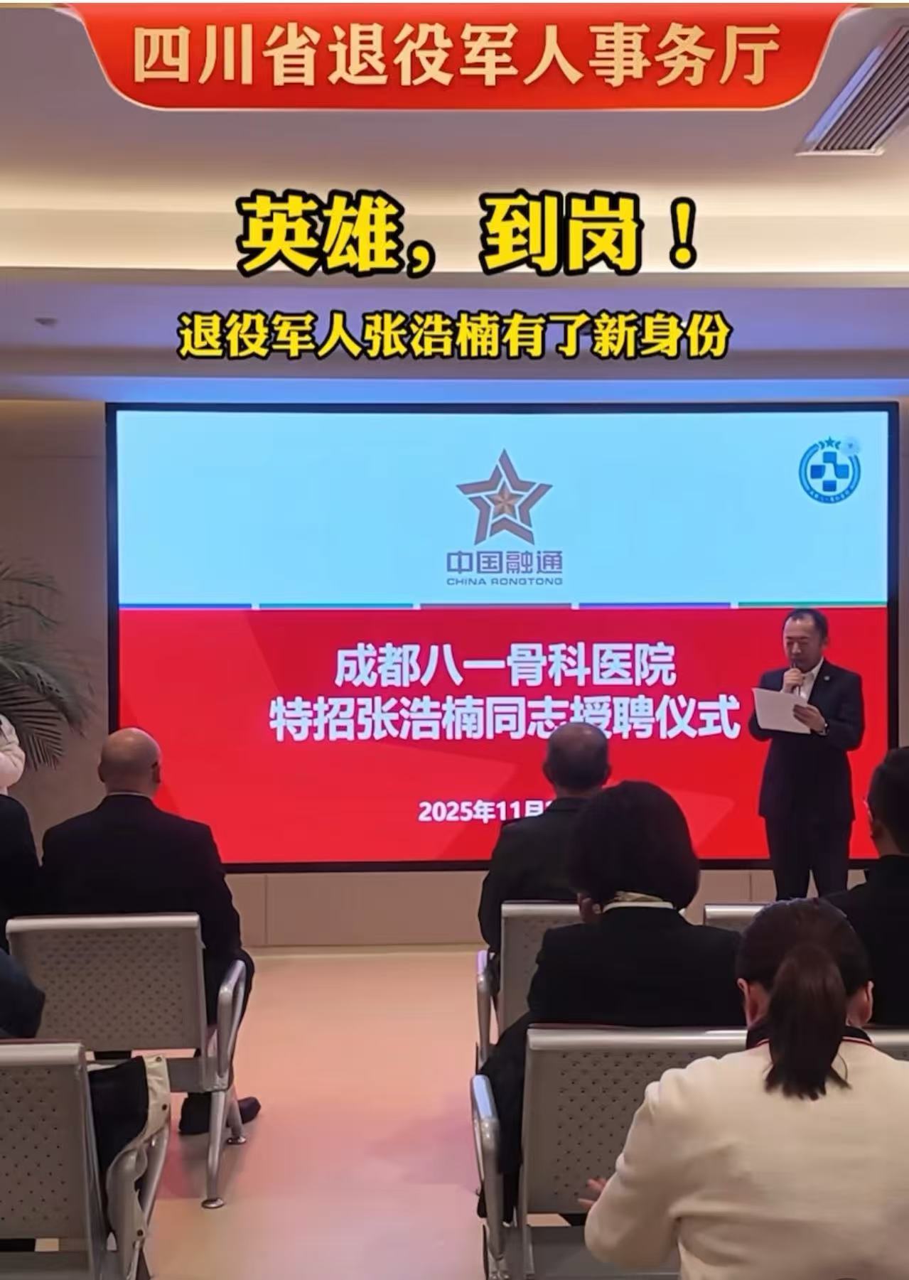 荣誉随后而来。除了被授予“见义勇为先进个人”称号,11月26日,中国融通医疗健康成都八一骨科医院向他发出了聘书。这家流淌着军队血脉的医院,为他提供了办公室干事的岗位。“张浩楠同志作为一名退役军人,他的正气和正能量与医院的发展方向一脉相承。”医院党委书记贺前松说。
