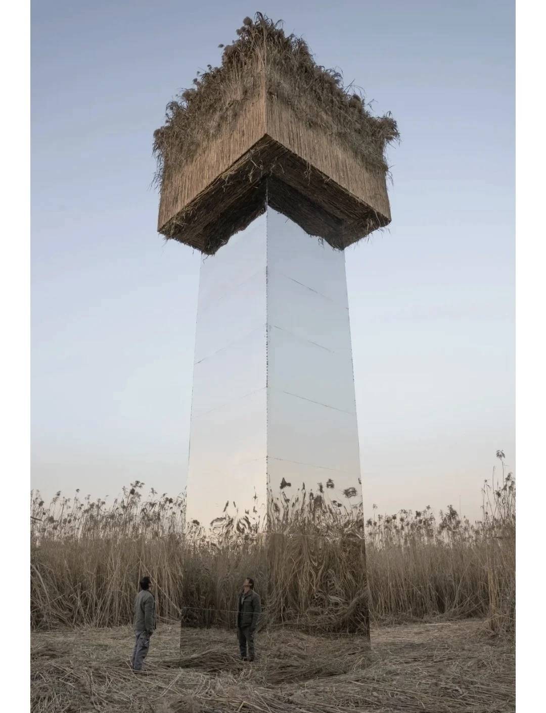 2025年12月6日起,“岳阳洞庭湖芦苇艺术节”在君山岛湿地安装了一件名为《浮土》的艺术装置。该装置采用灰色镜面不锈钢材料,呈现分段垂直结构,意图通过镜面反射探讨自然与观看的关系。