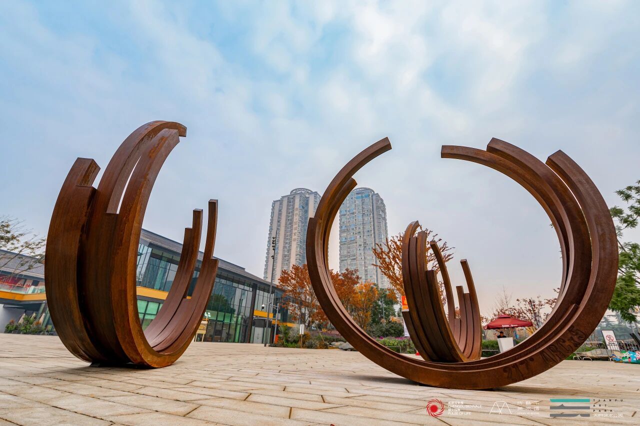 在紧邻成都三环路的天府艺术公园主入口,3个直径超4米的褐色耐候钢圆弧巍然矗立,各自朝向不同方向。这件名为《无序的弧:3条弧×5》的装置作品,出自法国国宝级艺术家贝纳・维内之手。