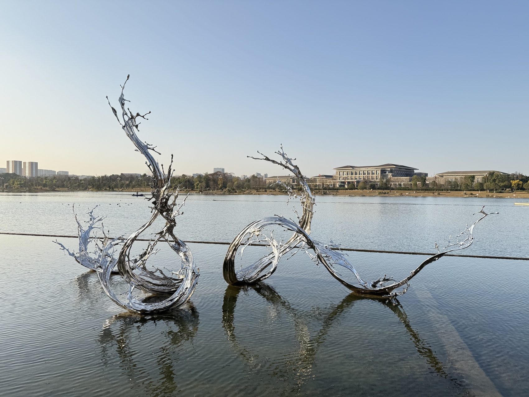 例如,郑路的雕塑《淋漓》,是唯一一件栖身水中的作品。银色不锈钢材质蜿蜒舒展,既似水面跃动的涟漪,又像虬曲生长的植物、腾空而起的蛟龙,在水光映照间更显灵动。马良与艺奇客艺术创作团队联手打造的《招财猫》,则凭借底部的 4 个轮子拥有了“移动”的活力,能与往来的市民游客趣味互动。