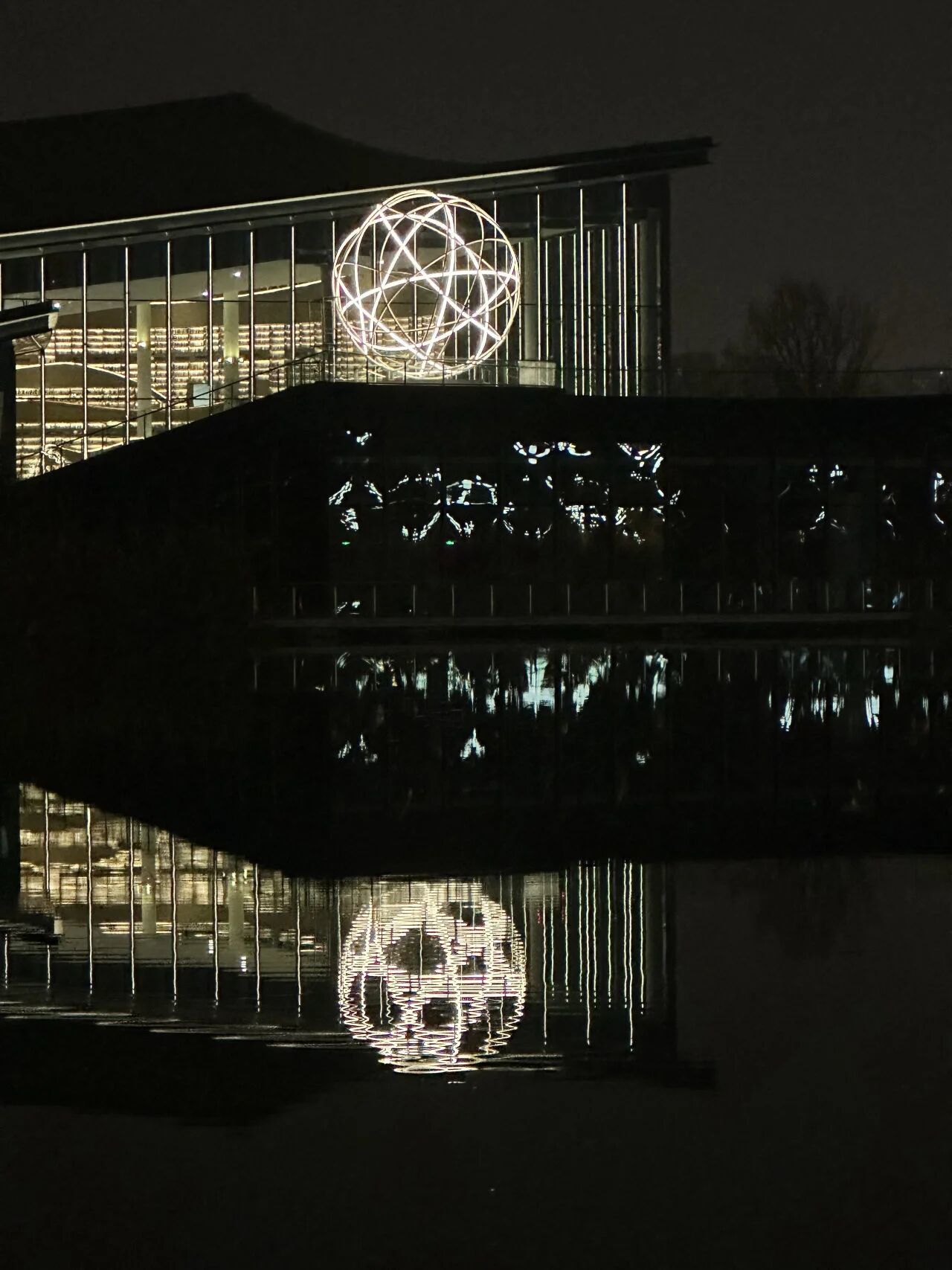 清华大学建筑学院长聘副教授黄蔚欣创作的《月茧》,由两个发光的金属杆件缠绕而成的球体组成,分别栖息于湖畔的美术馆和规划展览馆上。夜幕降临,两个球体上的LED灯亮起,遥相对望。“‘茧’是作品的核心隐喻,其内向发光的方式,模仿了自我省思的内心世界,在高度连接的数字时代,为都市人提供一处精神内观的庇护所。”