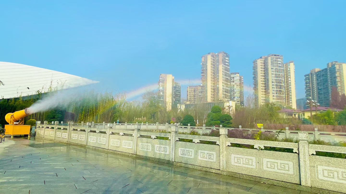 成都双年展户外展开幕后,冬日的蓉城不时迎来艳阳高照,这让艺术家杨千十分欣喜。他的作品《彩虹—成都》,主体是一台黄色雾炮,启动后便持续向空中喷射水雾,阳光洒落之际,一道绚烂的彩虹便悄然浮现。