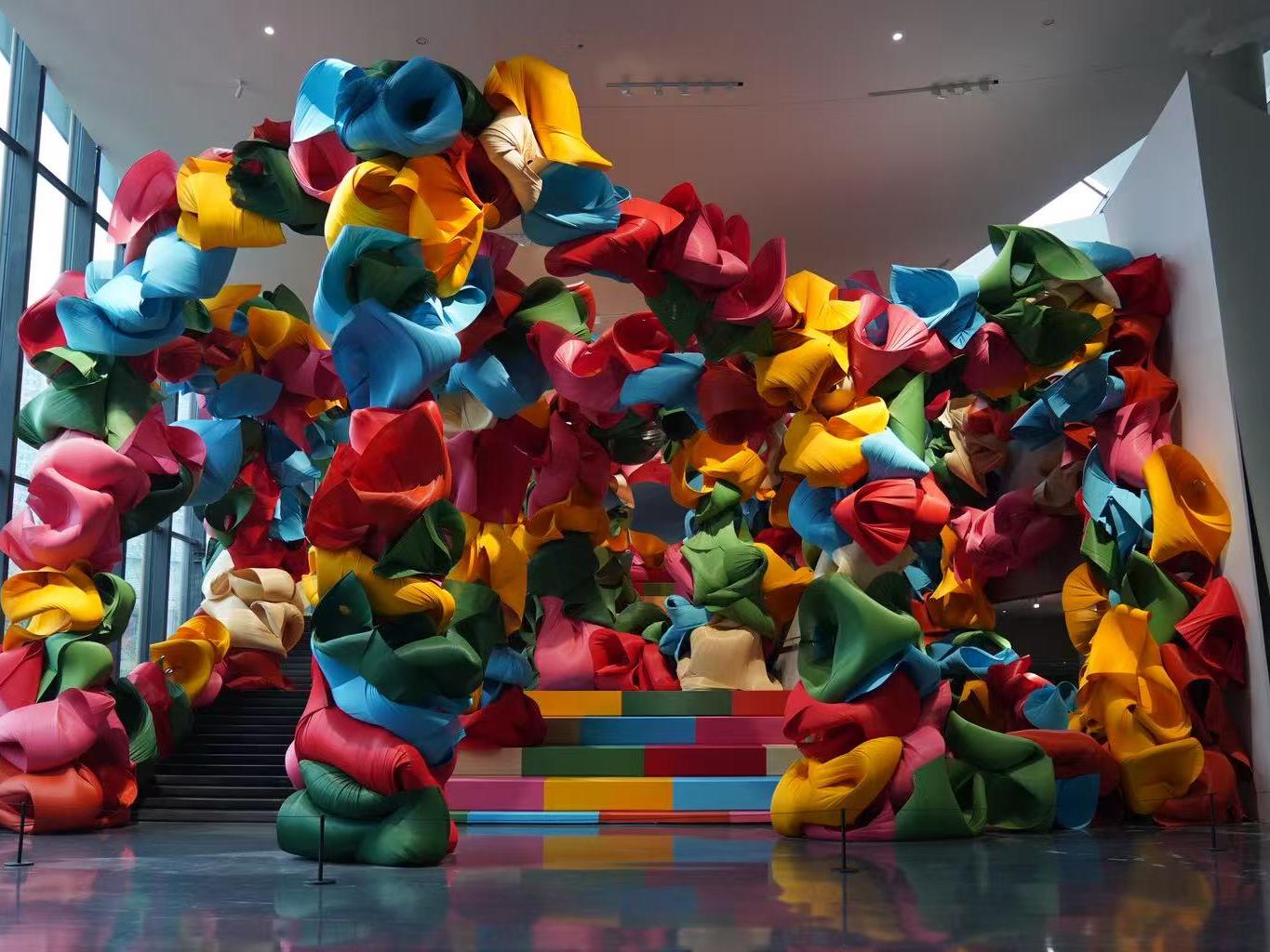 贝纳·维内和隋建国的作品,被放置在天府艺术公园内的商业街区;同时,还有不少作品被融入公园内的自然景观、文化空间。“此次户外展所在的天府艺术公园,既有美术馆、艺术馆和图书馆,也有商业街区,像是成都这座城市的缩影,与‘当艺术遇见烟火气’的理念不谋而合。”吴洪亮说。