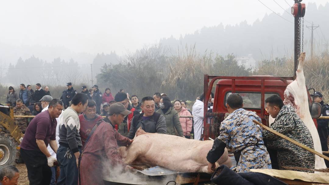 1月15日早上8时许,四川资阳安岳县通贤镇帽石村,田间露气还没散尽,临时搭建的灶台上已蒸腾起热气。不远处,有人正忙着杀猪,100多只鸡鸭鹅也在扑腾着翅膀。