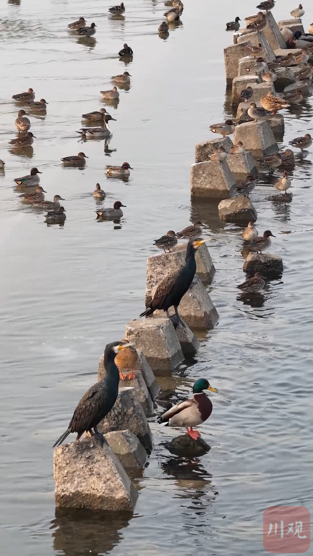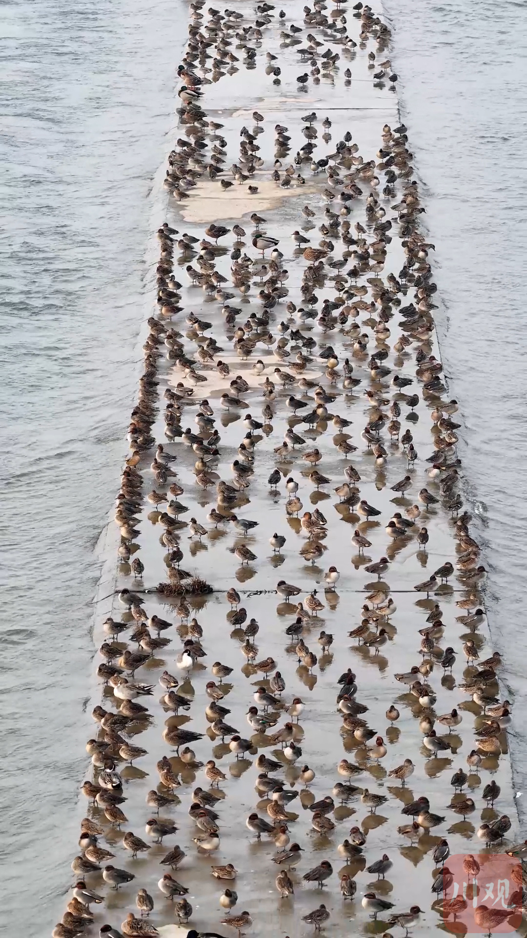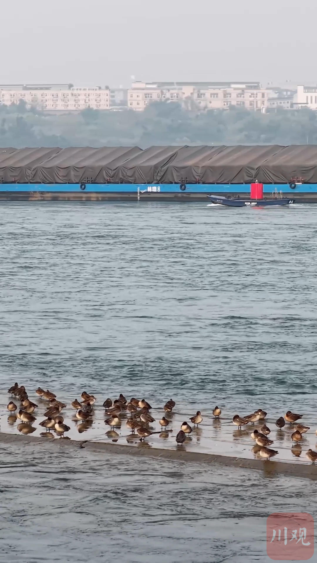 1月14日,宜宾南溪瀛洲岛长江拦水坝秒变 “春运站台”! 成群赤麻鸭、翘鼻麻鸭等候鸟,将这长约200米、宽仅两米多的堤坝挤得满满当当,上演 “鸟类春运” 大片。现场 “鸟山鸟海”,越冬候鸟 “一位难求”,场面十分壮观。