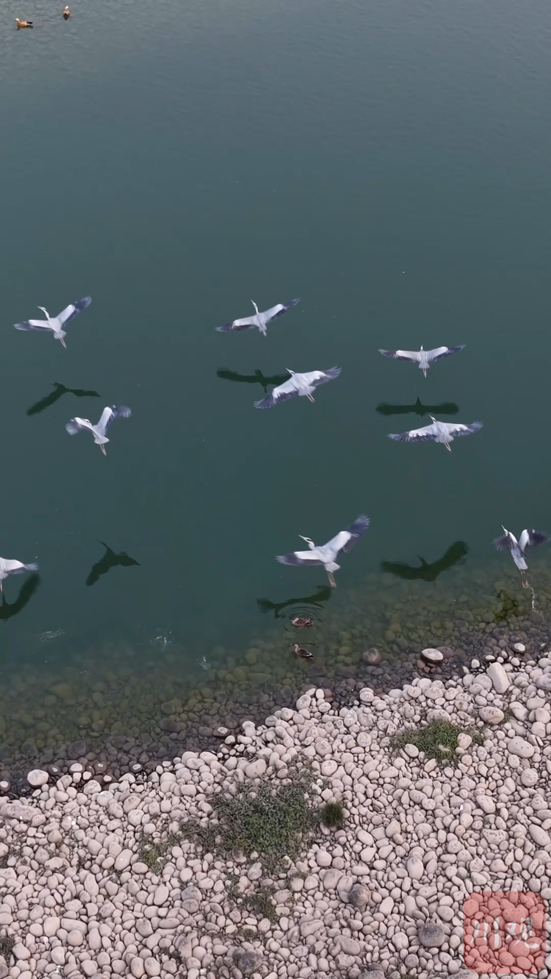 宜宾南溪瀛洲岛长江段,一群苍鹭振翅翱翔。