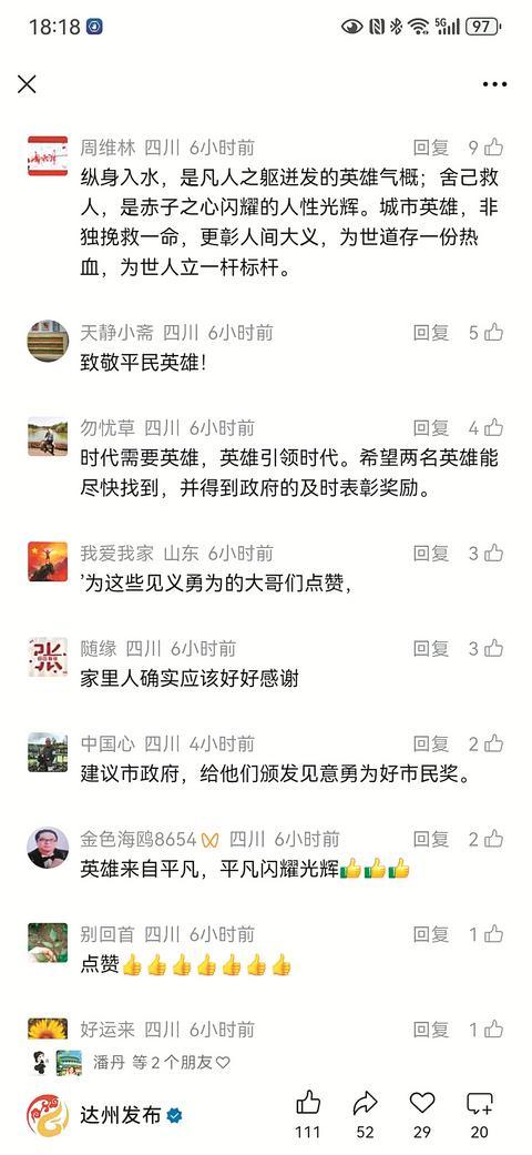 凡人微光,汇成暖流。一次次挺身而出,一个个善意举动,在不断涌现的平凡英雄身上,我们看到了这座城市最动人的底色。达州融媒微信公众号和达州发布微信公众号也分别以《全城寻人!2名跳河救人的勇士,你们在哪?》《扩散!达州全城寻人!》为题报道了此事,引发众多市民点赞关注。大家纷纷在评论区留言:“人间有爱,英雄无名,真英雄!”“纵身一跃,方显男儿本色;默默转身,尽现仁者初心。冰冷的河水挡不住热心,你的举动,温暖了一个家庭,也温暖了一座城。”“人间友爱,向救人无名英雄致敬。”……