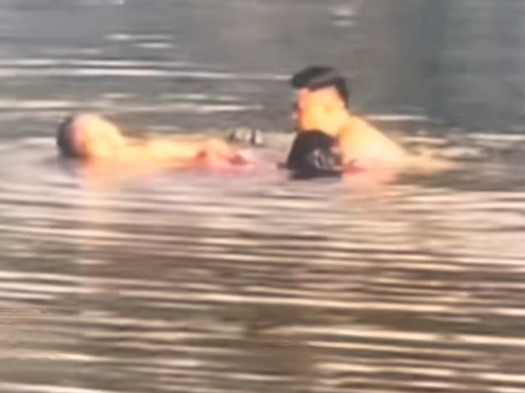 此时,刘洲注意到另一位救人者——李世安拿到了热心群众从桥上抛下的救生圈。“我赶紧喊他等我一下。”两人在水中会合,搭着救生圈,共同向女子方向推进。