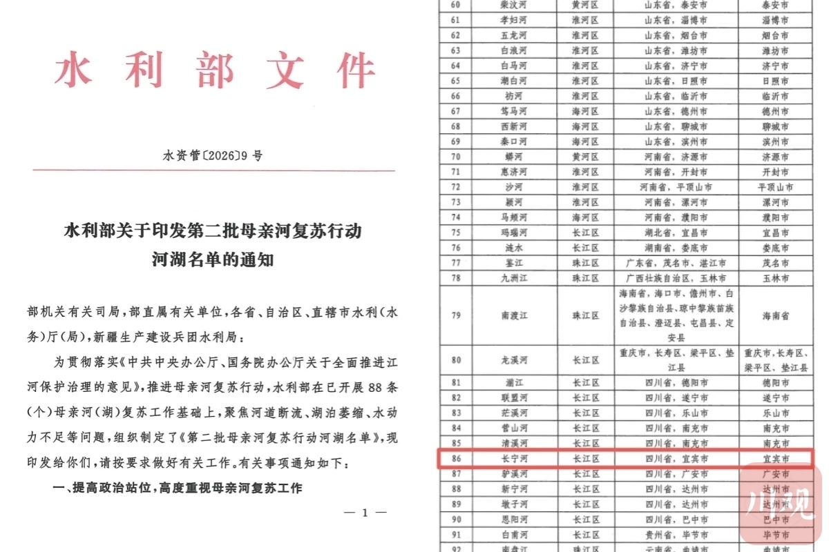 近日,水利部正式印发《第二批母亲河复苏行动河湖名单》,全国111条(个)河(湖)入选新一轮复苏行动。其中,长宁河入选,是四川省10条江河之一、宜宾市唯一入选河流。