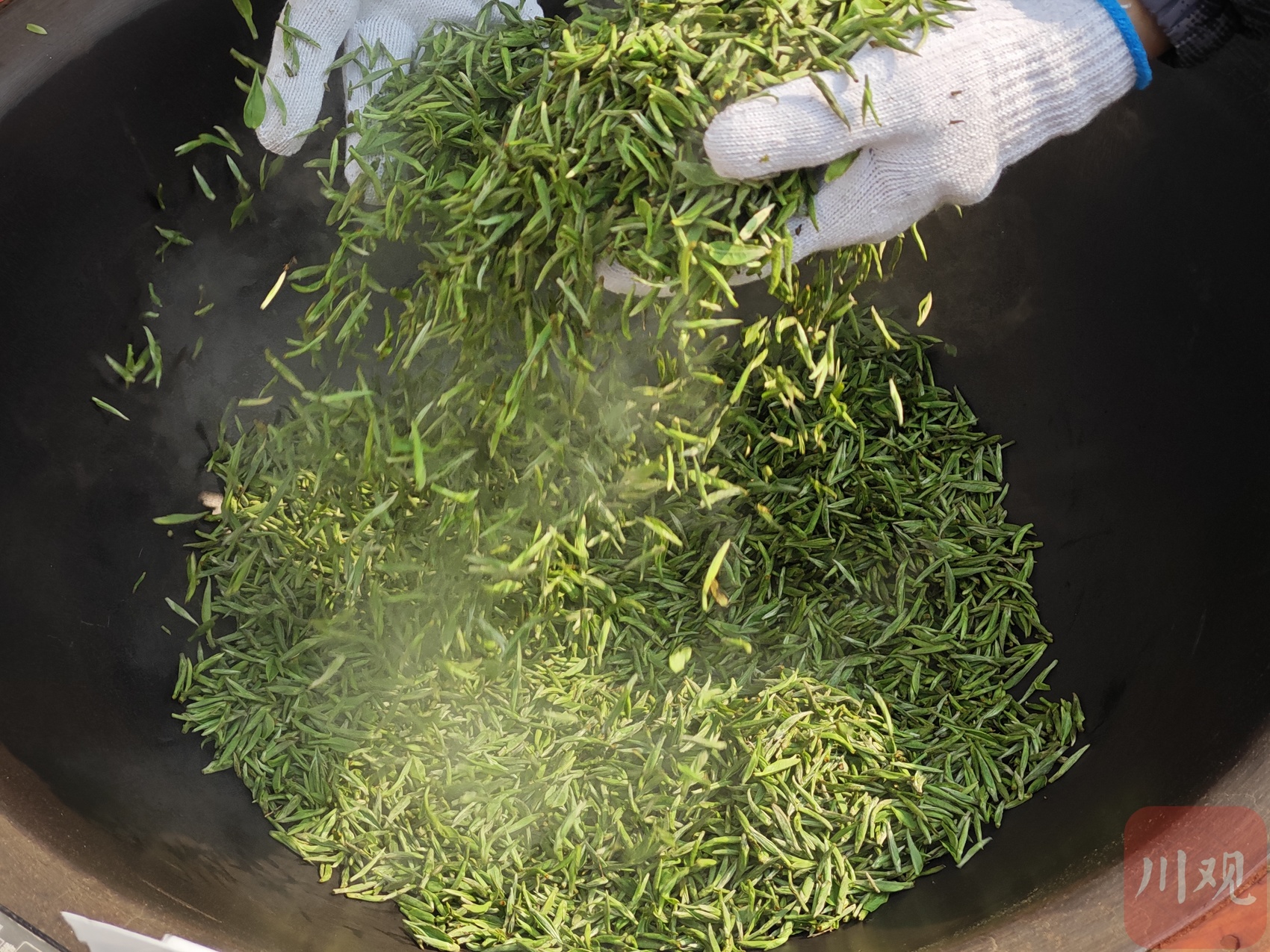 鲜叶采下后,旅程才刚刚开始。当天,采收的五十余斤鲜叶被分批送往加工厂,经过连夜加工,这些茶叶次日便能发往全国各地。在决定风味最为核心的环节——“杀青”上,罗加奎去年用上了新设备。“我们使用蒸汽杀青机,实现连续化生产,温度控制也更稳定,能够牢牢锁住早茶特有的清香和嫩香。”