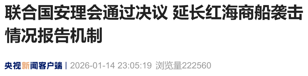 联合国安理会通过决议,延长红海商船袭击情况报告机制。