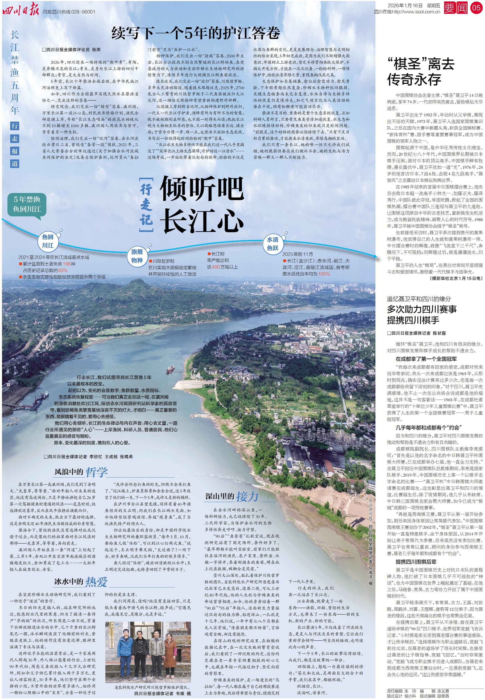 作为长江上游生态屏障,四川在长江禁渔十年“期中考”中交出了亮眼答卷。通过渔民转型、跨省协同治理、珍稀物种抢救与技术攻关,长江生态持续向好。5年实践,重塑了人与长江的关系,长江鲟、川陕哲罗鲑等珍稀物种重获生机,渔民退捕上岸开启新生活……关注五版,看四川如何书写护江答卷。