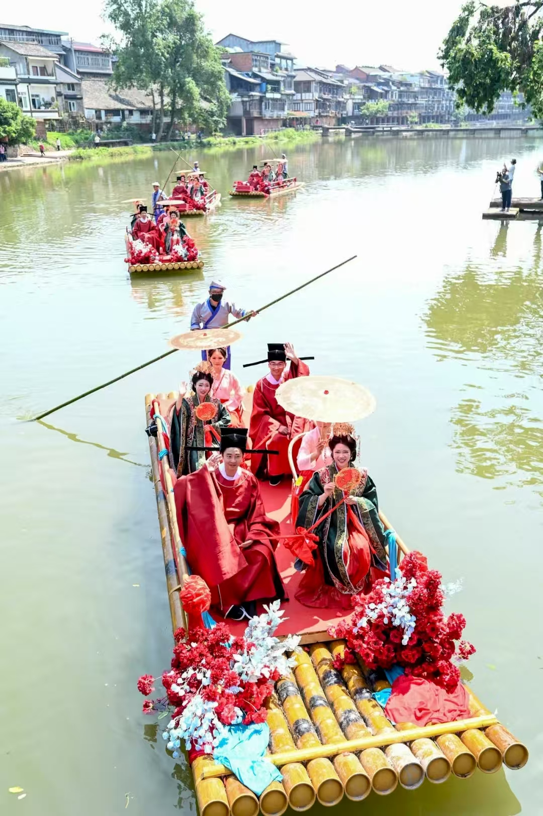 2025年,邛崃市举办5.20“穿越汉韵 情定夹关”群众婚俗文化活动水上婚礼