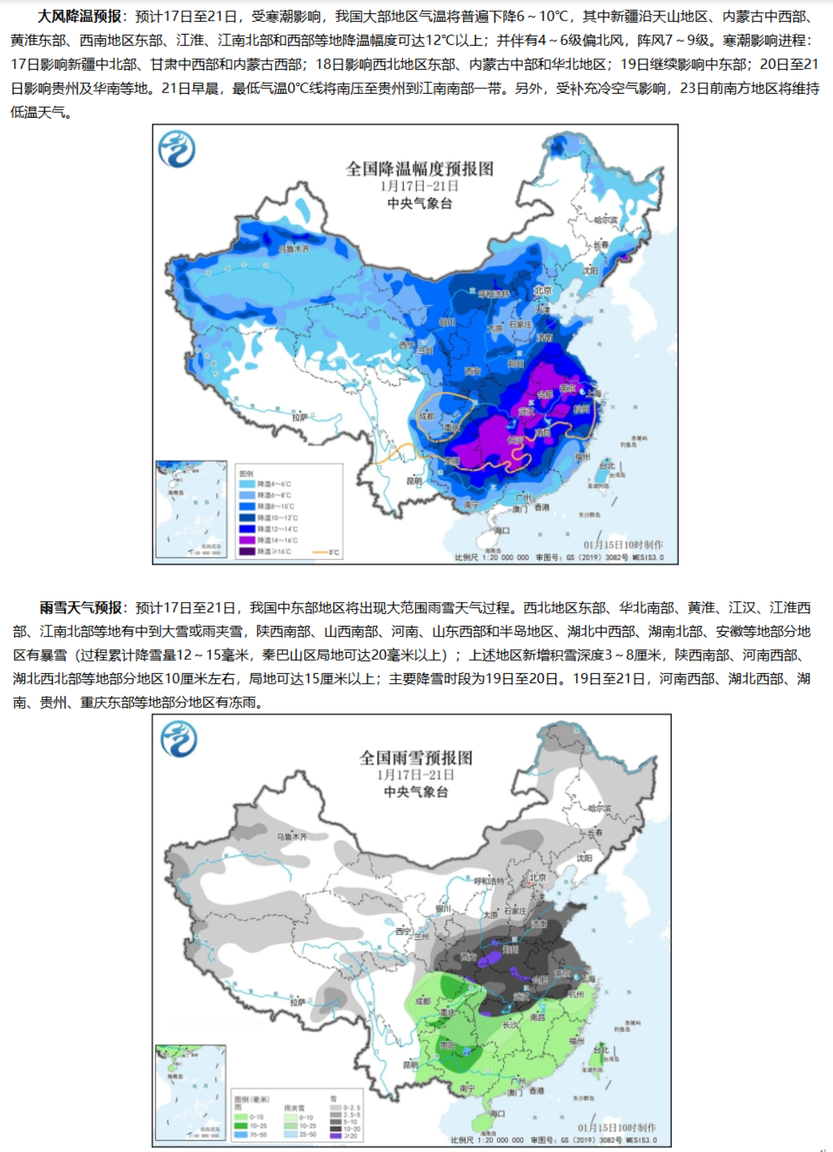 中央气象台1月15日下午发布重要天气提示:预计1月17日至21日,寒潮过程将影响我国,带来大风降温天气,南方地区气温下降显著;中东部地区将出现入冬以来最强雨雪冰冻天气过程,部分地区有冻雨。