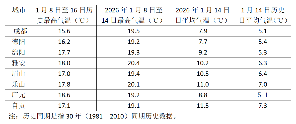 截至2026年1月14日,今冬“三九”期间实况气温创新高的部分四川城市。 数据来源:四川省公共气象服务网
