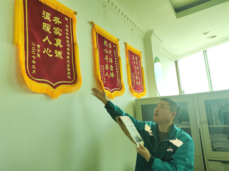 1月4日早晨,中国邮政集团有限公司宜宾市分公司办公楼内,55岁的投递业务管理员马永强身着洗得微微发白的绿色邮政工作服在岗。胸前的党员徽章擦拭得锃亮,他从抽屉里取出一摞泛黄的资料,里面整齐夹着写满感谢话语的明信片与信件——这是他28年邮递生涯里最珍视的“宝贝”。身后墙面上,一面鲜红绒布锦旗格外醒目,“当代绿衣天使,真心为民服务”十二个金黄大字熠熠生辉,落款“李庄镇罗铭琪等人”与“2000年12月”的时间印记,诉说着一段跨越海峡的往事。