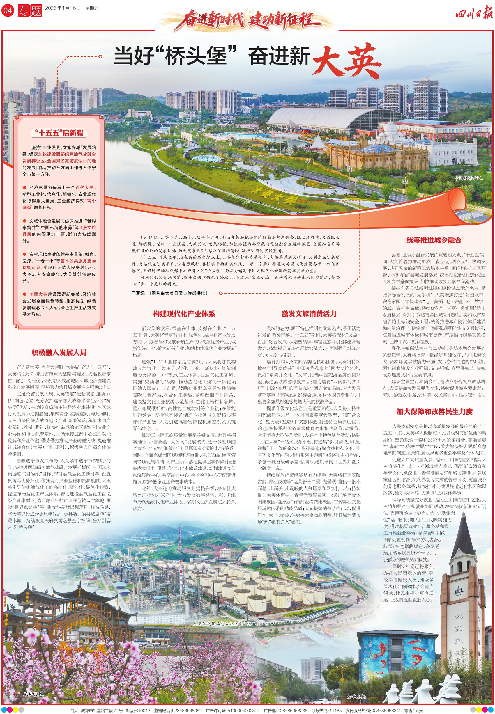 奋进新大英,当有大视野、大格局。奋进“十五五”,大英将主动对接国省市重大战略与规划,找准职责定位、锚定目标任务,深度融入成渝地区双城经济圈建设和全市发展版图,借势聚力为县域发展注入强劲动能。