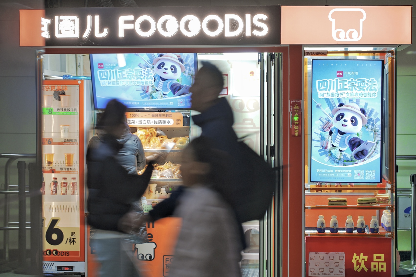 清晨通勤的地铁站,人流如织,步履匆匆。忽然间,一抹毛茸茸的身影悄悄“潜入”视线——便利店的电子屏上,一只圆头圆脑的熊猫正背着行囊、握着手机,一副“随时出发”的模样,让不少赶路的乘客不自觉放慢了脚步。