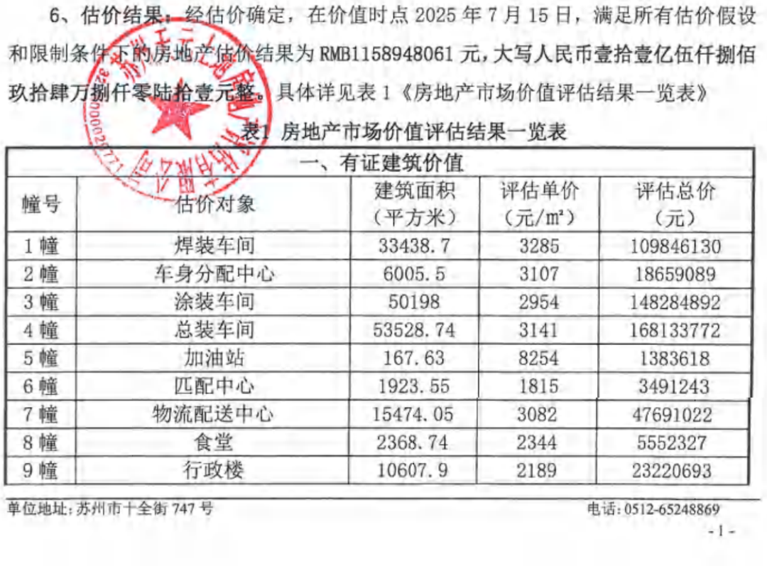 另一份涉执房地产处置司法评估报告显示,该工厂内有证建筑共25幢建筑物,登记建筑总面积为183148.04平方米,另有无证建筑、构筑物等。其中有证建筑评估总价5.5亿元,折合单价3014.35元,具体来看焊装车间单价3285元、车身分配中心3107元/平方米、总装车间3141元/平方米、食堂2344元/平方米、行政楼2189元/平方米。