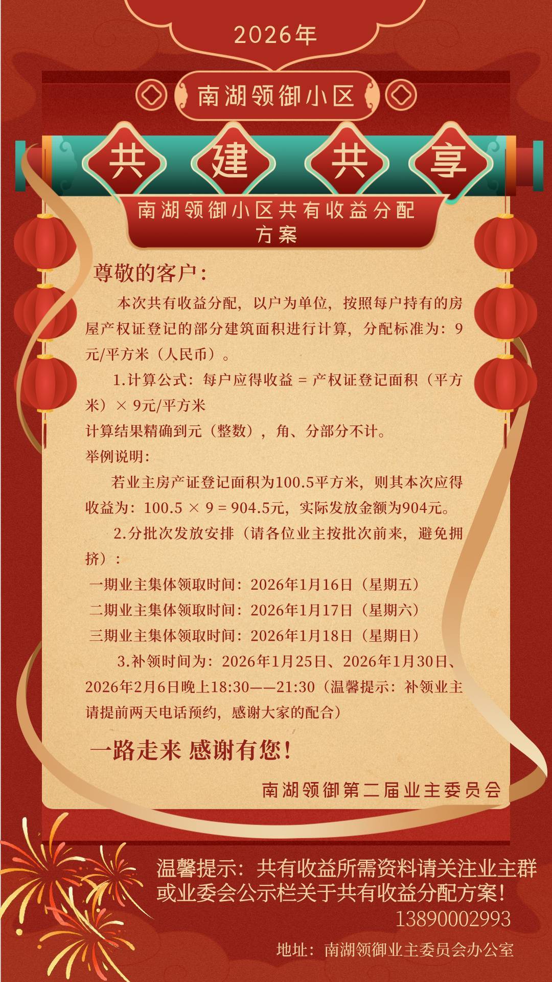 1月7日,该小区业委会发布公告,公布小区共有收益分配方案。方案上,详细写明了发放“红包”的计算公式:每户应得收益=产权证登记面积(平方米)×9元/平方米,计算结果精确到元。