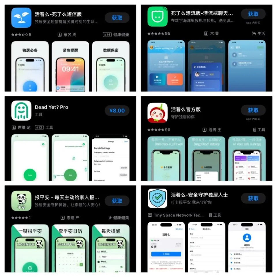 目前在苹果和安卓应用商店,均无法搜索到“死了么”,但存在大量同类应用,例如“活着么”“死了么漂流版”“Dead Yet?”“报平安”等等,均面向独居人群,功能形式也与“死了么”极为相似。