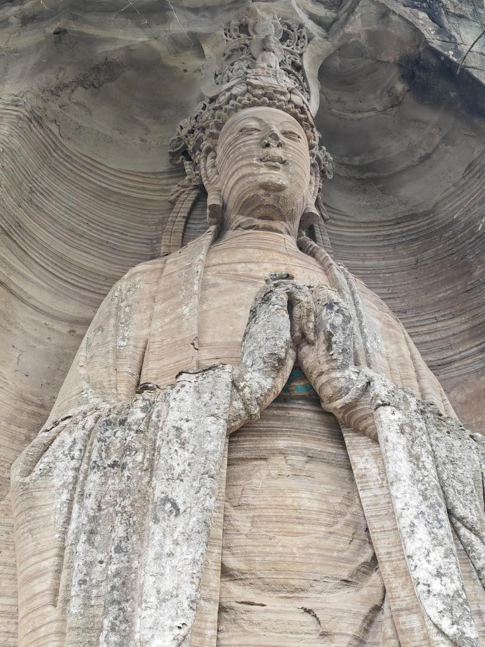 2025年12月四日在四川省资阳市安岳县茗山寺拍摄的造像,其身上风化的痕迹被网友称为“从唐宋吹来的风”。新华每日电讯记者 赵怡宁 摄