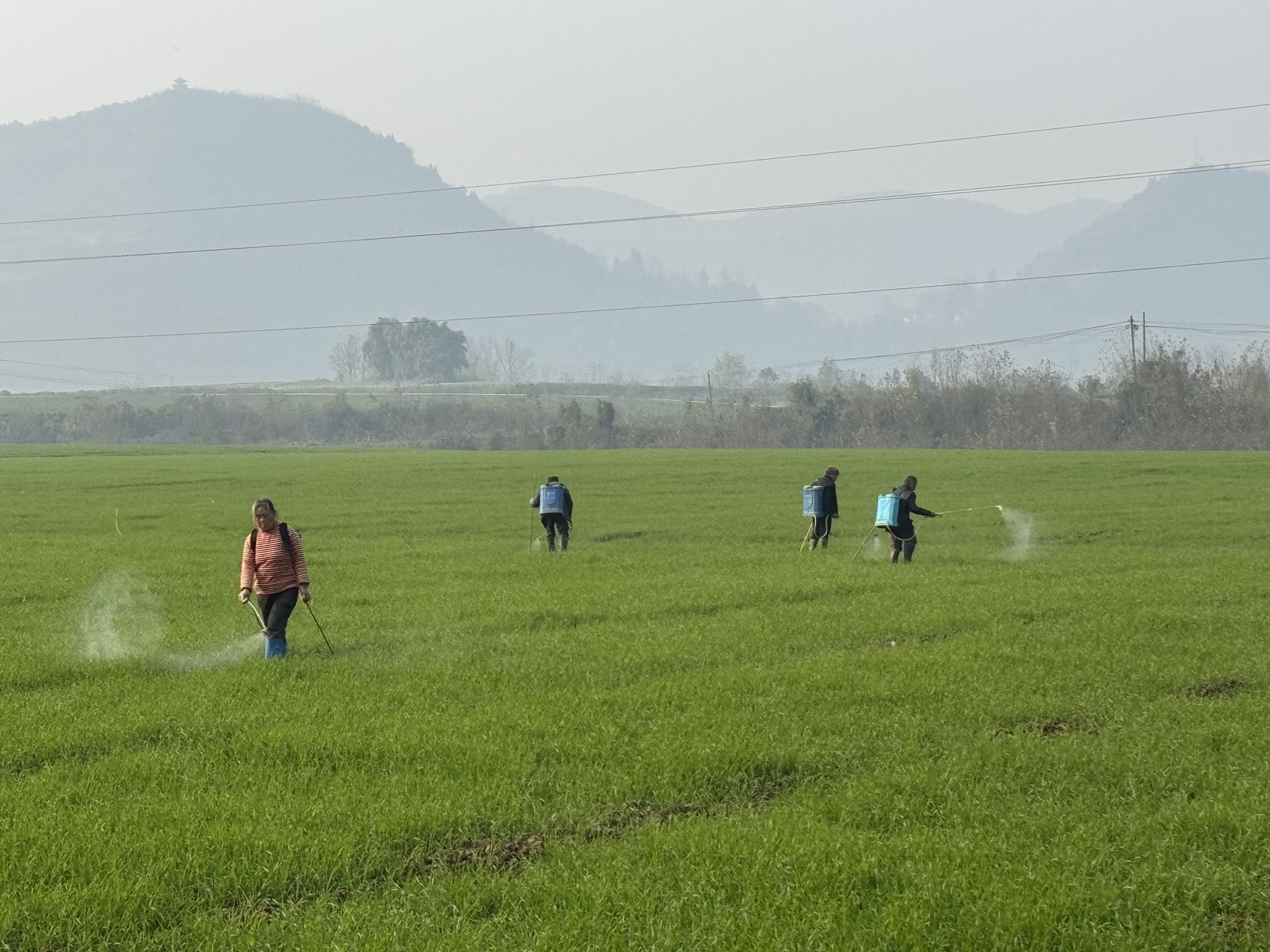 农户们在田间施用除草剂。