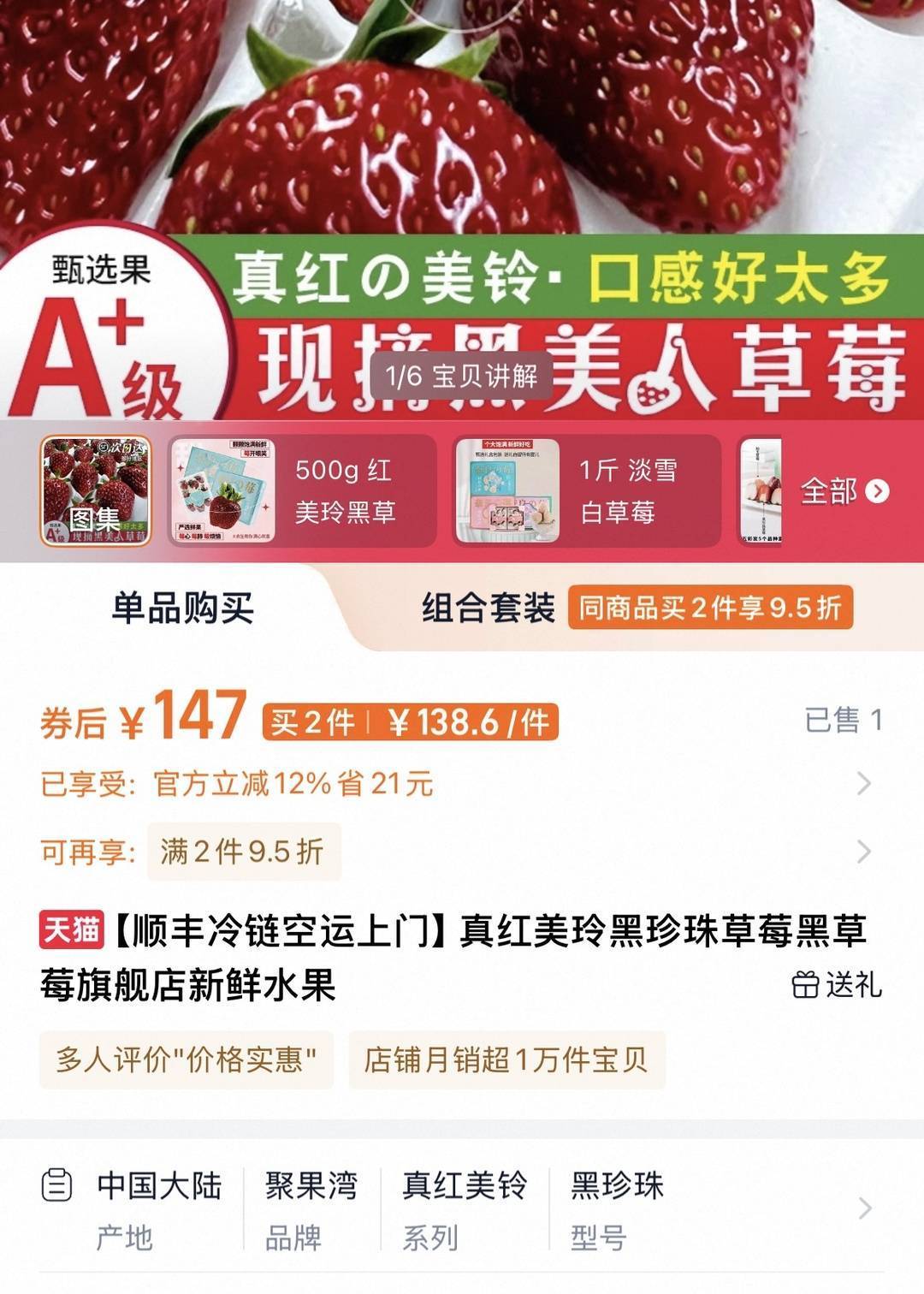 在商家的宣传中,突出宣传了“黑草莓”甜度高、色泽亮丽、多汁等。不过,其销售数据却不像其价格这样“天花板”——除了几家销量达到900+、1000+,不少销量只有个位数。