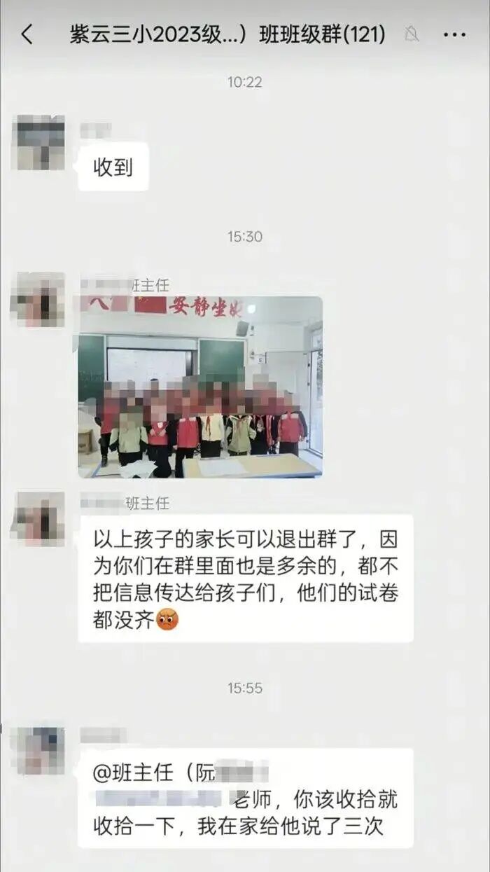 据新黄河消息,近日,有网友在社交平台发布一张班级微信群聊天截图称,贵州省安顺市紫云自治县第三小学某班主任阮某某,在班级微信群晒出10多名未交齐试卷的学生照片。该老师称上述学生家长在群里“多余”,可以退群了,此事引发关注。