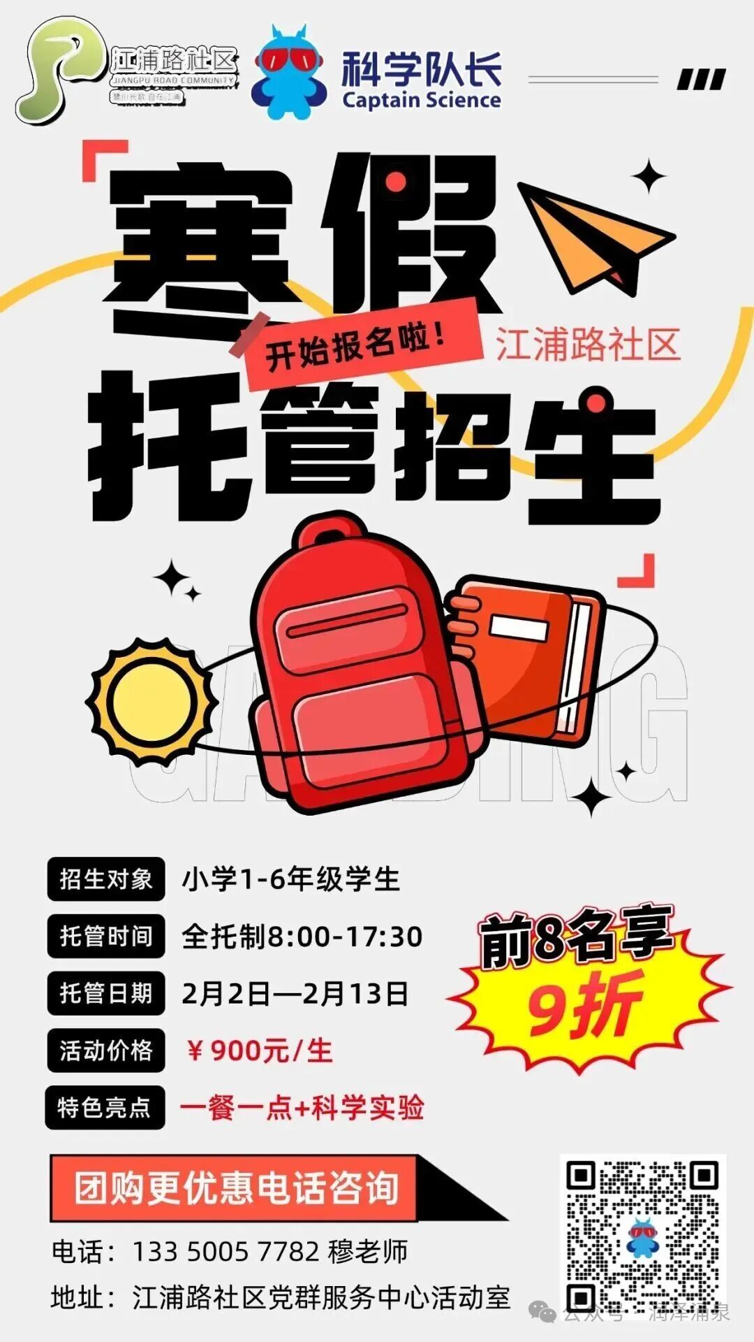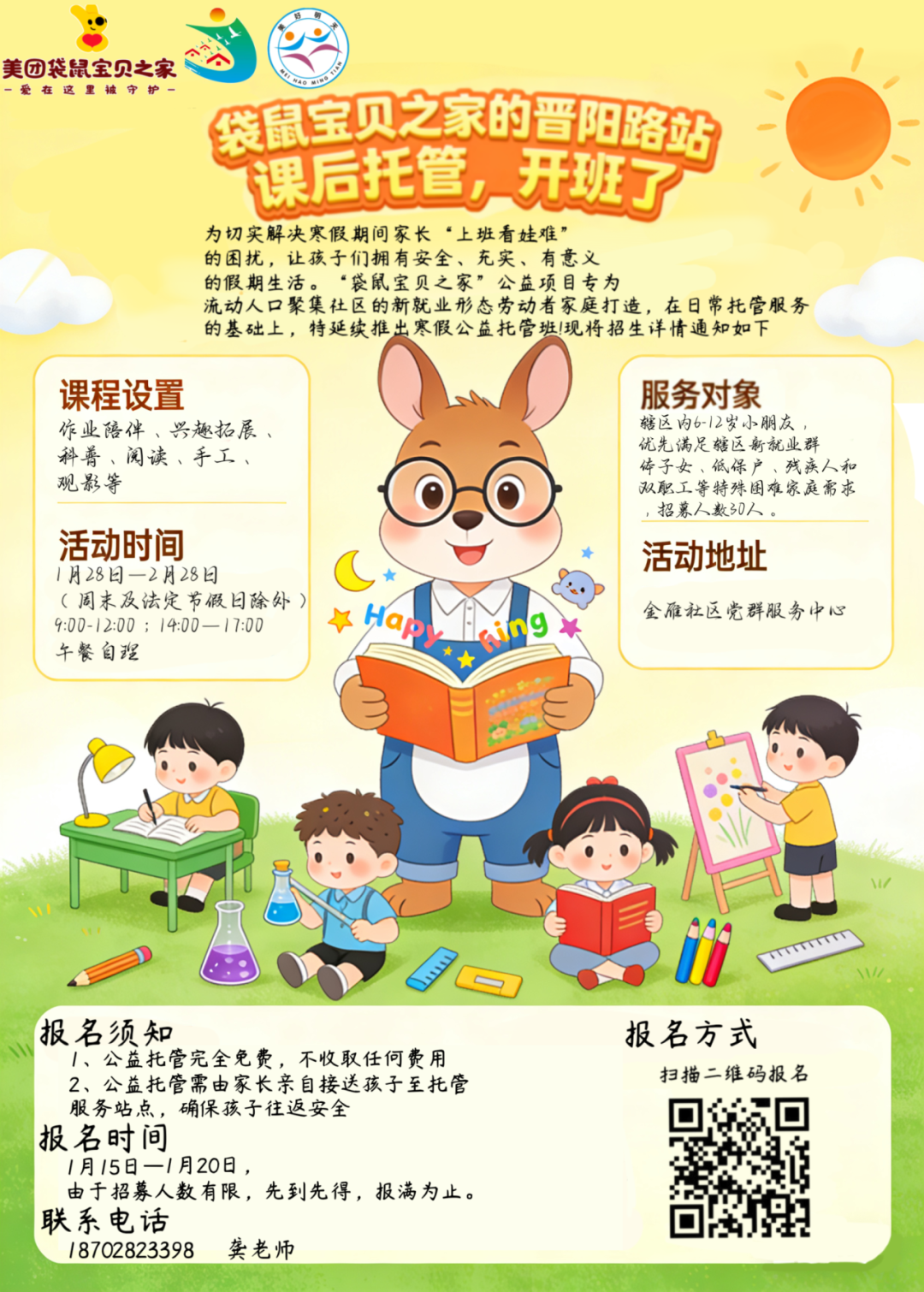 作业陪伴、兴趣拓展、科普、阅读、手工、观影等。活动时间1月28日—2月28日(周末及法定节假日除外),9:00—12:00、14:00—17:00 ,午餐自理。