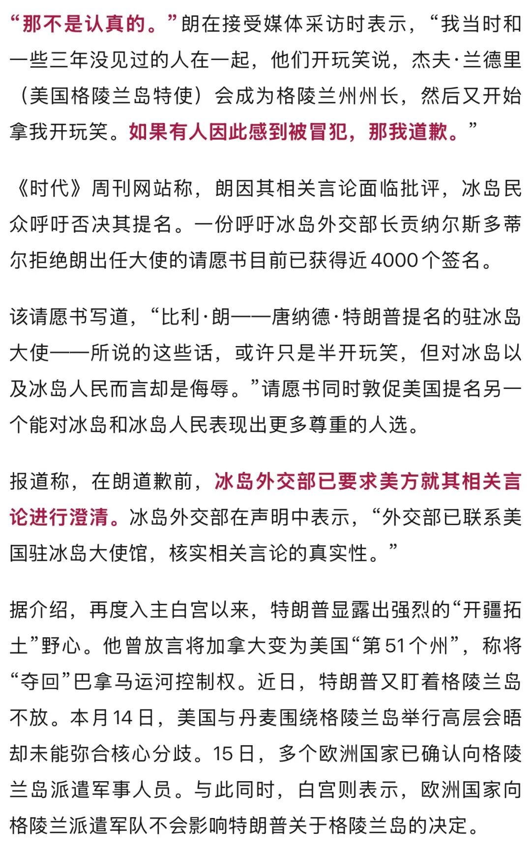 据美国“政治新闻网”、《时代》周刊网站等媒体报道,在美国威胁吞并格陵兰岛的紧张局势不断升温之际,美国总统特朗普提名的驻冰岛大使候选人比利·朗当地时间13日在众议院与议员交谈时,开玩笑称冰岛可能成为美国“第52个州”,而他将出任州长。该言论引发外界强烈抨击,冰岛外交部要求美方就其相关言论进行澄清,朗本人随后就此事道歉。