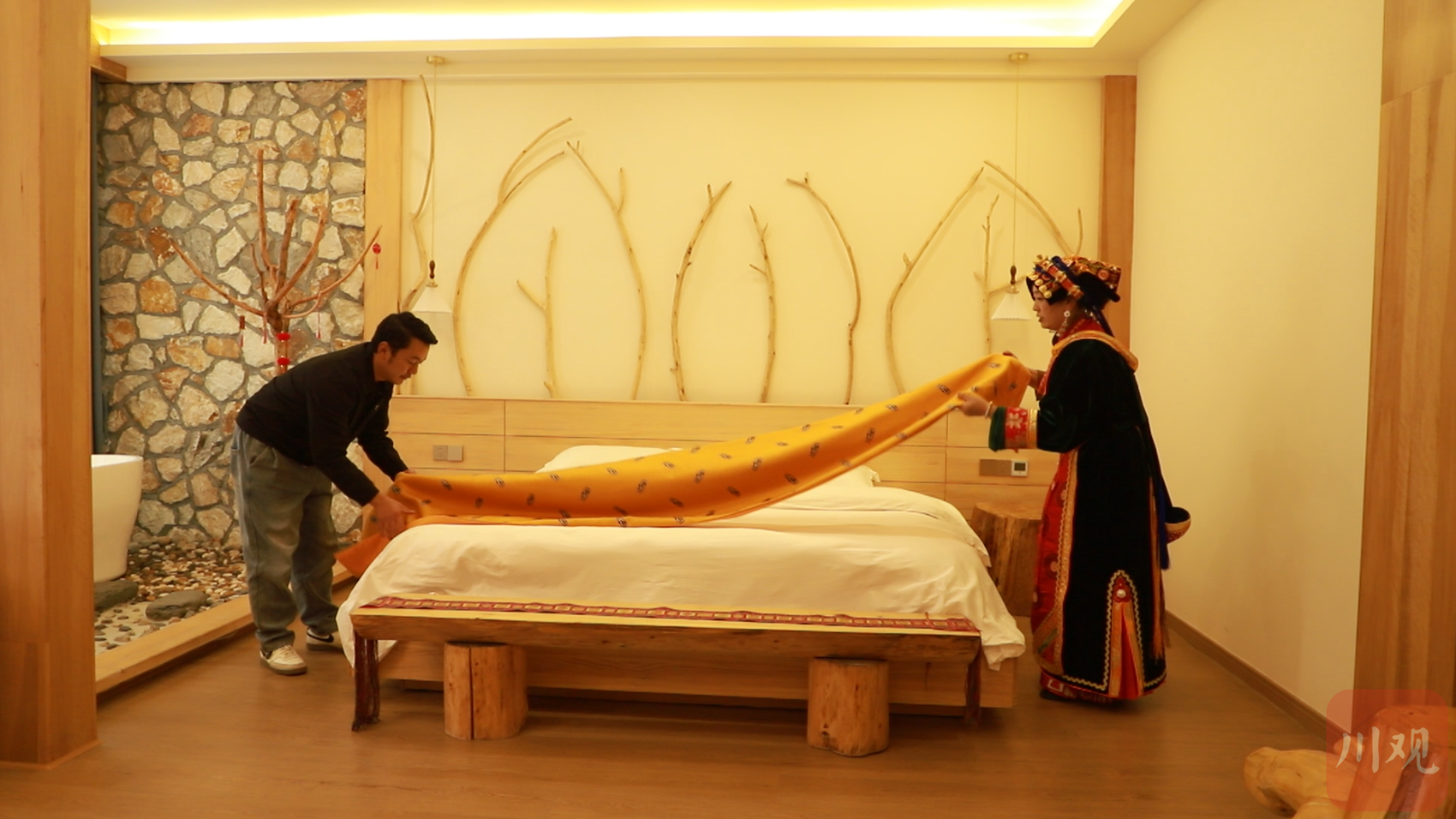 记者走进香巴拉民宿房间内看到,床头没有床头柜,是两根从山里打回的木桩。浴缸外圈放着从当地河床里捡回的防滑鹅暖石。盥洗池旁,放置的是藏家人之前用过的洗脸架和瓷盆。