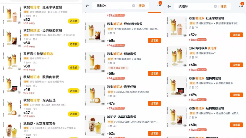 记者近日搜索发现,“琥珀奶”单杯售价24元起,外送确实只能在“裕莲茶楼”小程序、淘宝闪购与美团外卖平台上购买捆绑其他饮品或茶点的套餐,售价从48元至66元不等。如“琥珀奶单人套餐”,包含一杯琥珀奶、一份泡芙与一份蜜饯,售价56元起。京东秒送平台未上架琥珀奶相关产品与套餐。