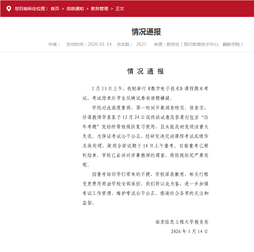 1月14日,南京信息工程大学教务处发布一则情况通报: