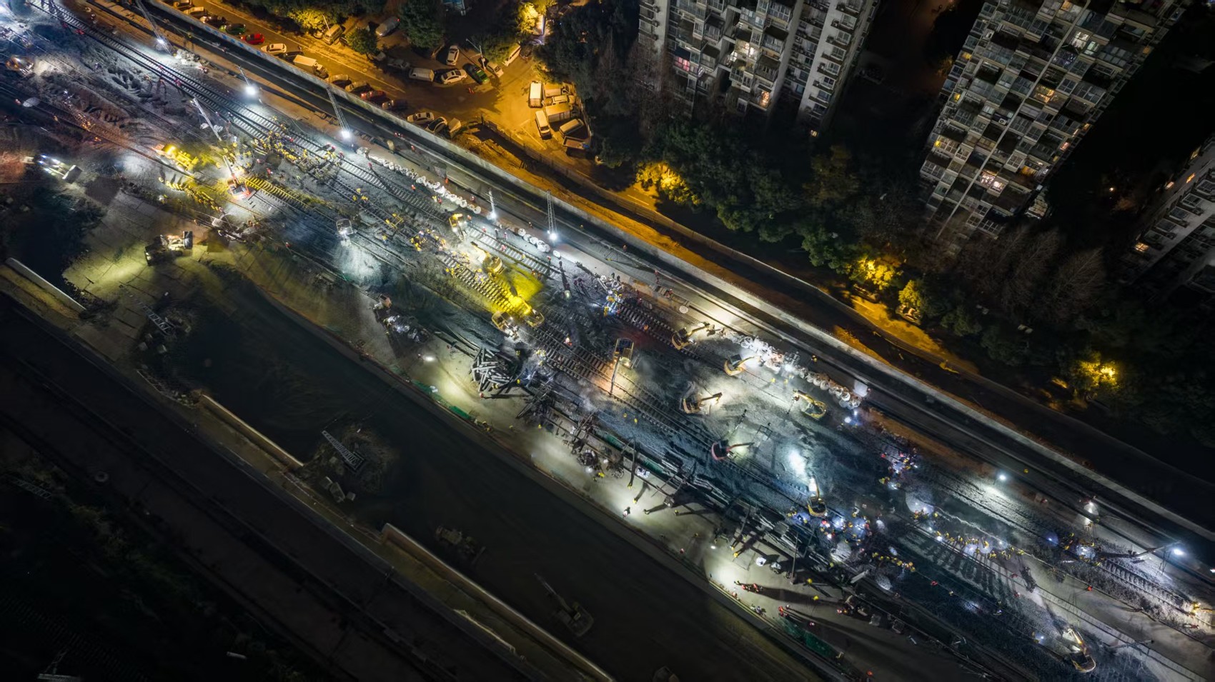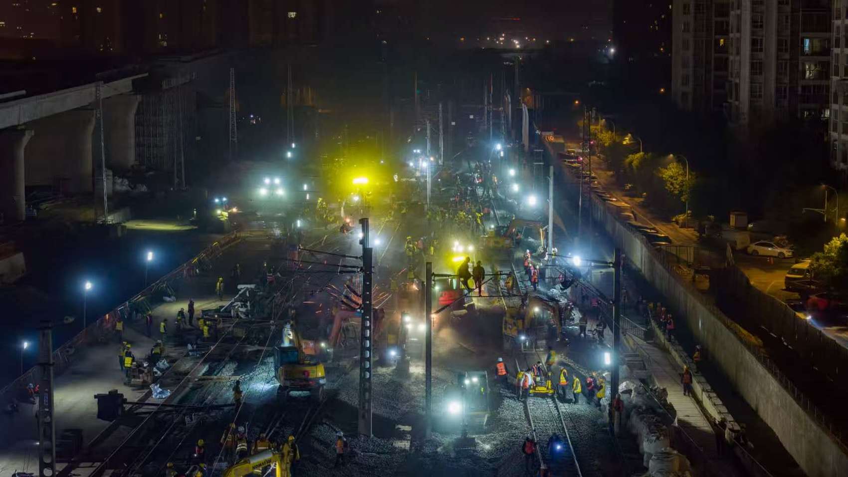 成都建设指挥部副指挥长邓蜀昌介绍,施工涉及成都站东咽喉、八里站西咽喉、八里站东咽喉及客机整备所等4个作业面,共有20余家单位参与,共投入近千名作业人员、百余台机械设备,完成了成渝铁路、达成铁路总计643米的线路拨接与整修,启用新线路3.2公里、新道岔16组,并同步实施了八里站信号系统倒替等改造工作。施工时间自1月15日22时30分开始,至16日4时结束,历时5小时30分钟。