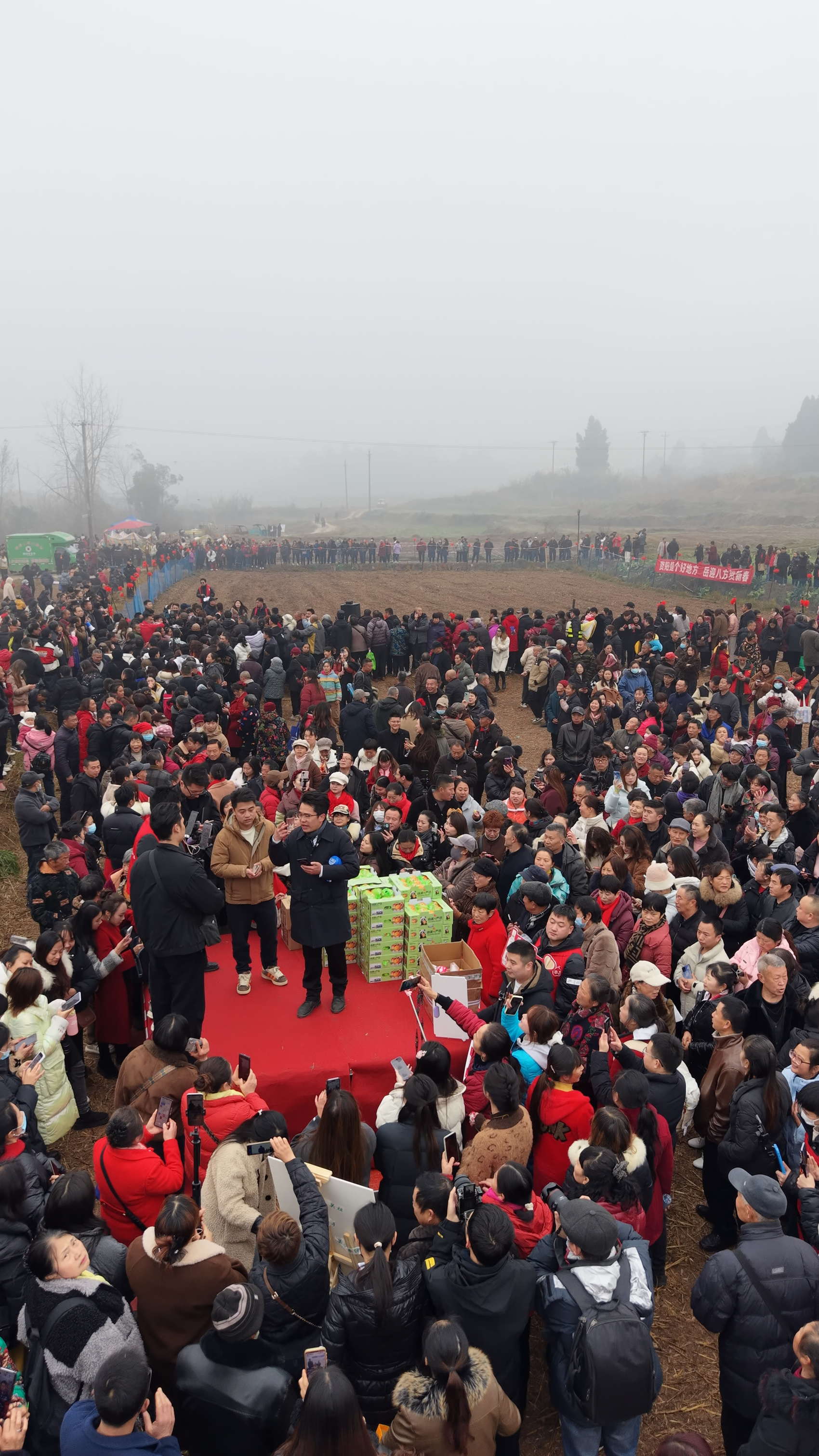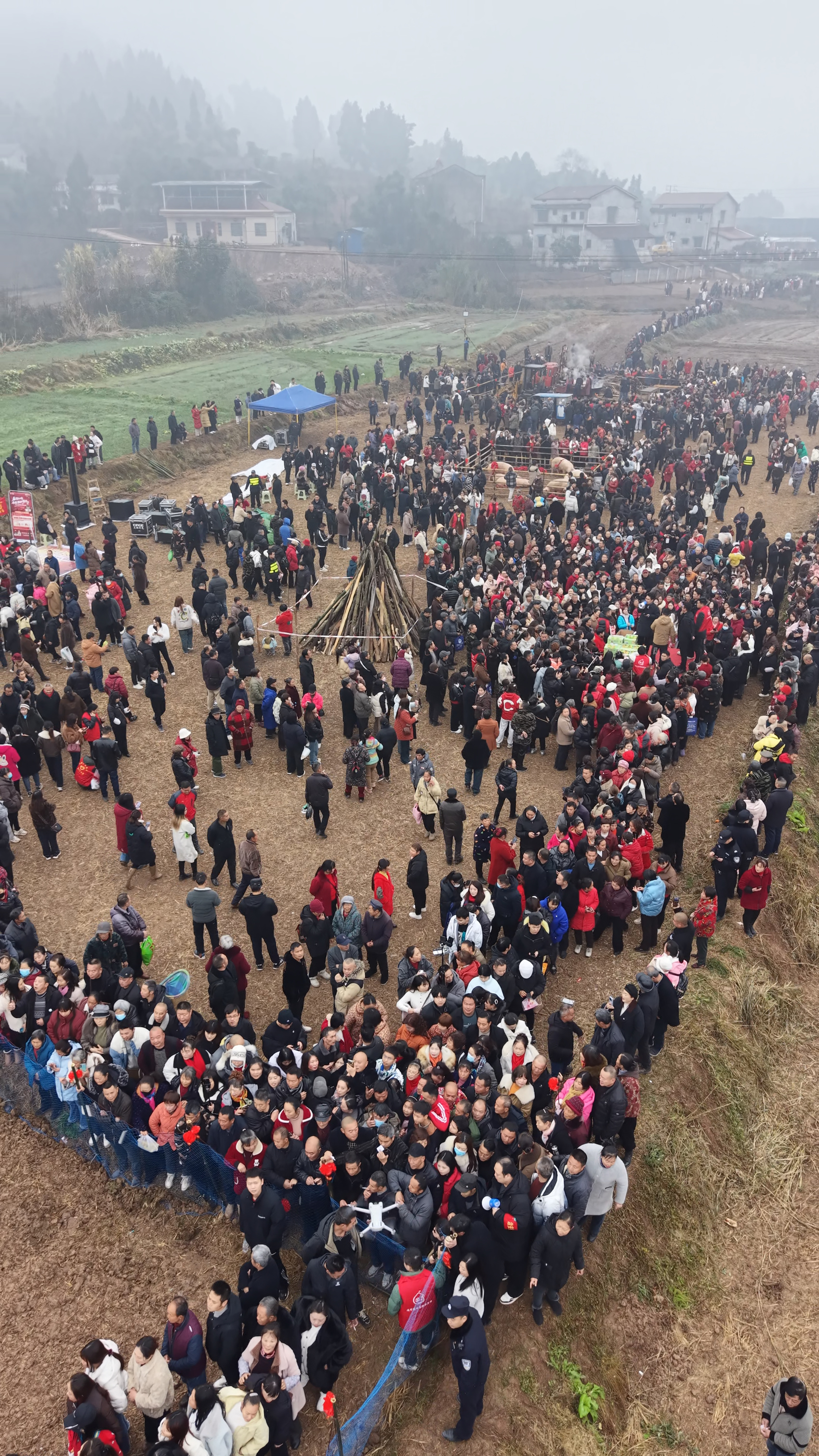 截至当日中午12时30分,这场刨猪宴直播在视频号平台的观看人次已突破50万,线上热度持续攀升。而线下的火爆程度,更超出了关祖苹的预期。“原本预计一两千人到现场,没想到现场实际来了2万多人,还有不少游客堵在了路上,加起来约有5万人,我感觉自己好像‘捅了篓子’。”他一边在直播间反复提醒路上的游客注意安全,一边建议大家可先前往安岳卧佛院参观摩崖石刻,错峰前往活动现场。