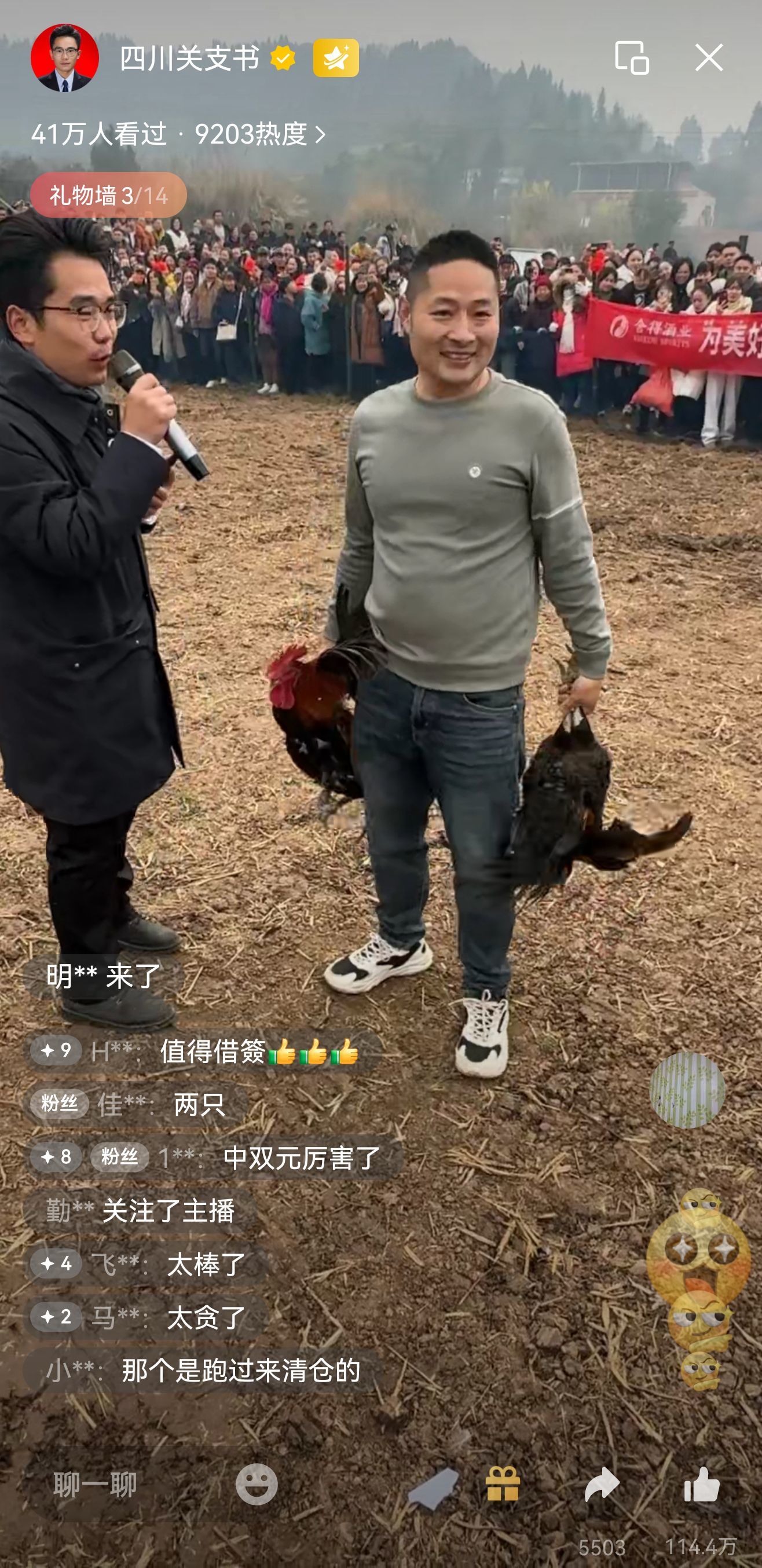 一名小伙子成功抓到一只鸡后,对着镜头真诚感慨:“如果每个村都有这样用心的支书,乡村一定能发展得越来越好。”直播间内,网友们也纷纷留言点赞:“喜欢农村这种风土人情。”“把直播间搬进田间地头,太接地气了!”